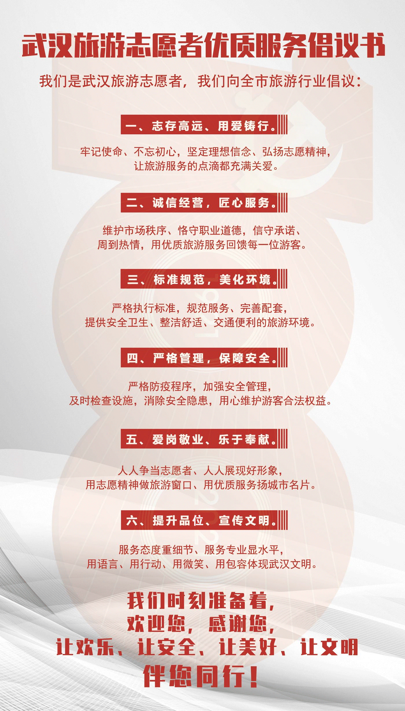 “五一”假期将至,武汉市作为全国热门旅游目的地,预计会迎来新一波旅游高峰。为着力提升在汉游客的满意度,强化旅游服务质量提升,推广红色资源,传承红色文化,擦亮城市名片,武汉旅游志愿者率先对全市文化和旅游工作者发出《武汉旅游志愿者优质服务倡议书》,号召全市文化和旅游从业人员提高政治站位,坚定理念信念,发扬艰苦奋斗精神,以优质服务展英雄城市风采。