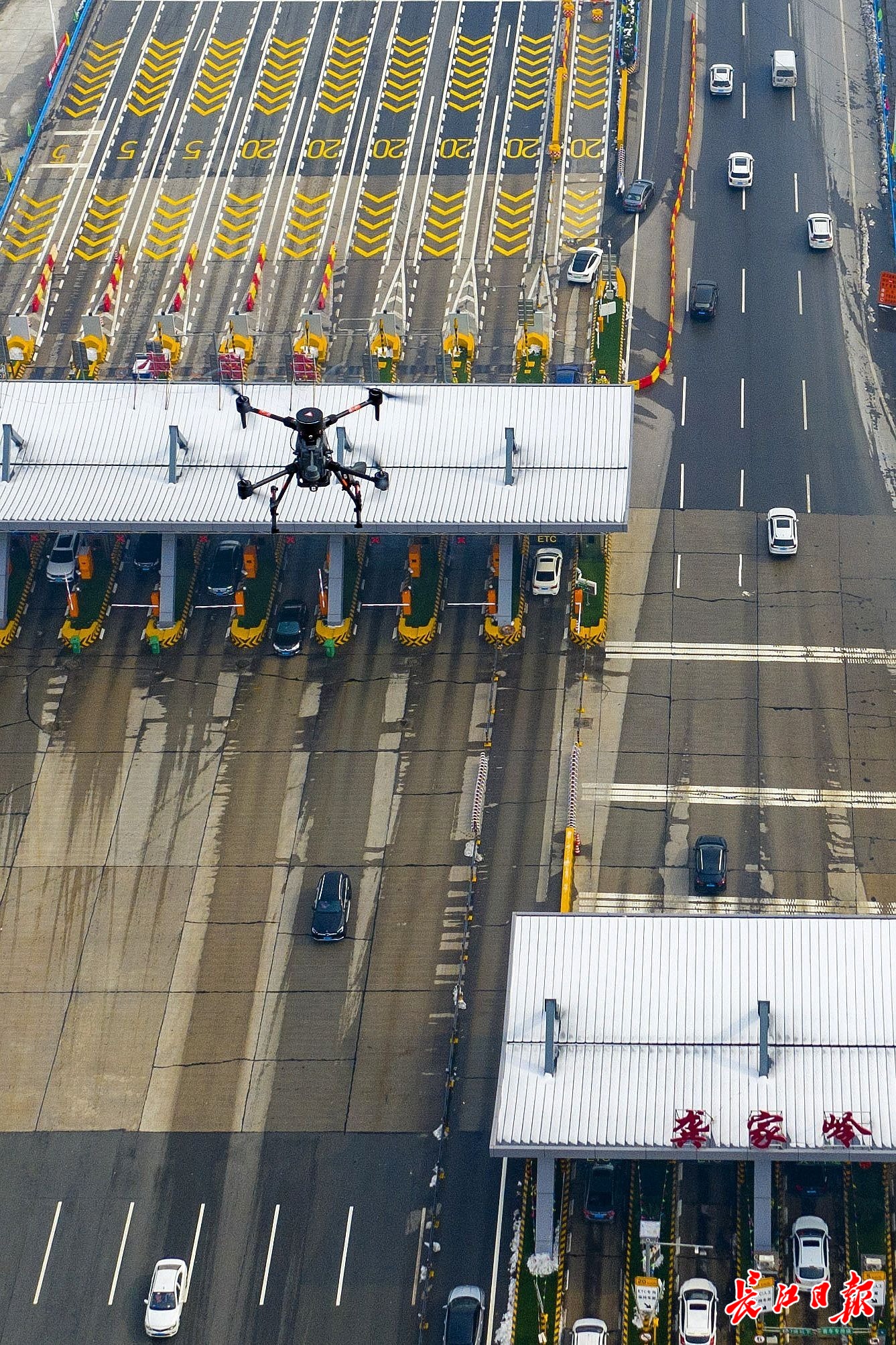 2月8日,搭载了高清红外摄像头、扩音器等设备的普宙科技无人机经过武鄂高速龚家岭收费站,一路巡飞监测路况。 记者周超 摄