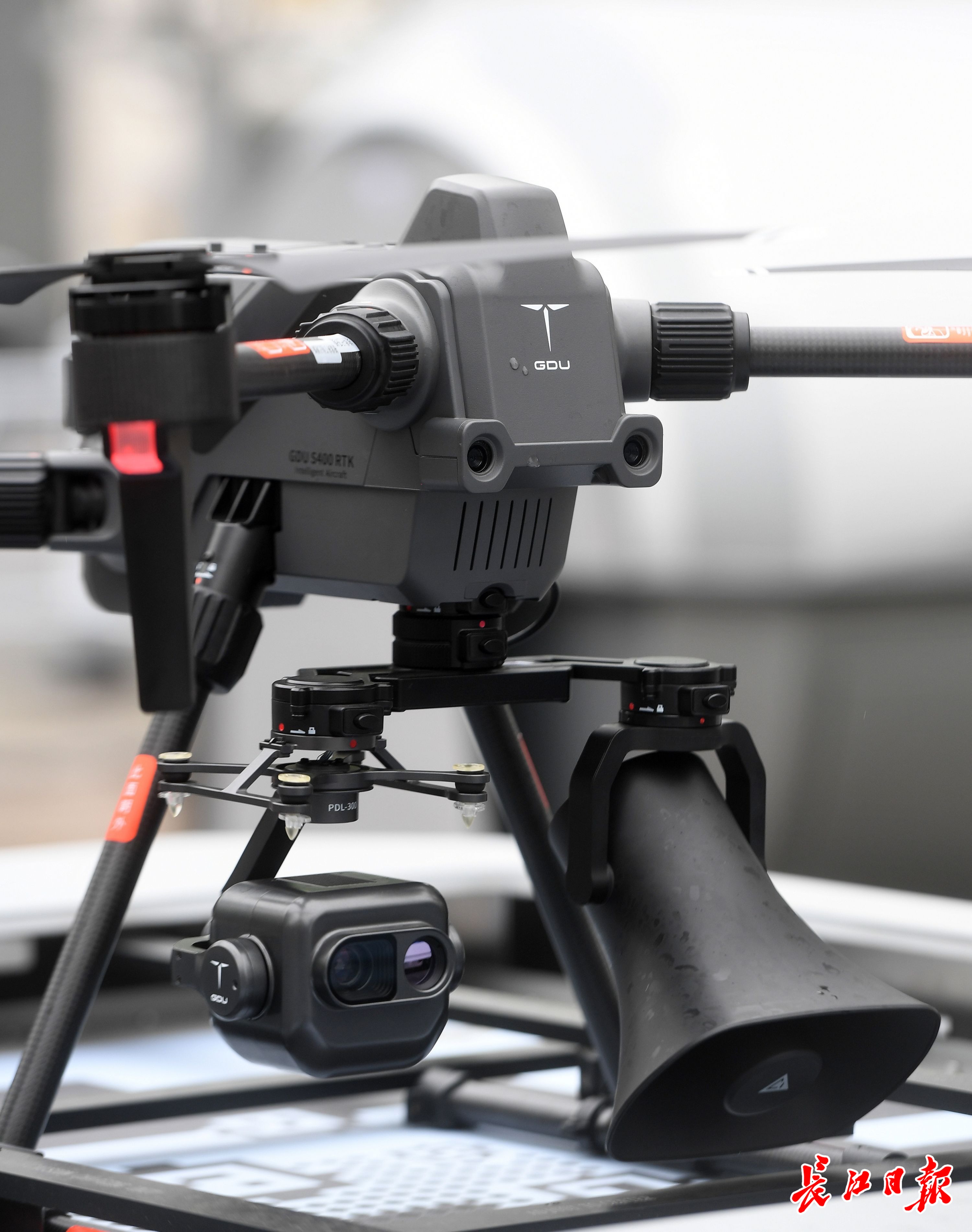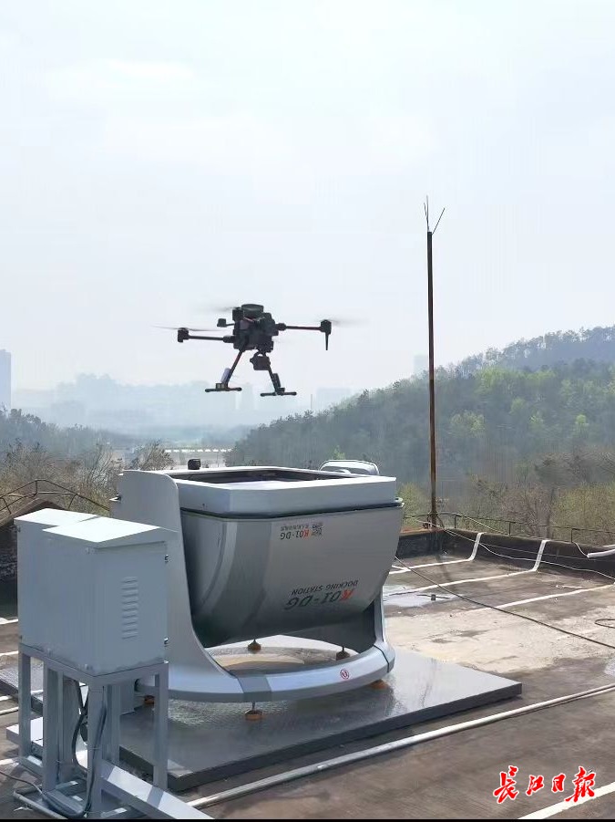 “嗡”!清晨7时,光谷的楼宇间,银灰色的圆形无人机机库准时旋开,桨叶飞旋,一架架无人机跃起,开始定向巡航。车流量、拥堵、违停等交通信息,实时发送到东湖高新区交通大队的指挥中心。
