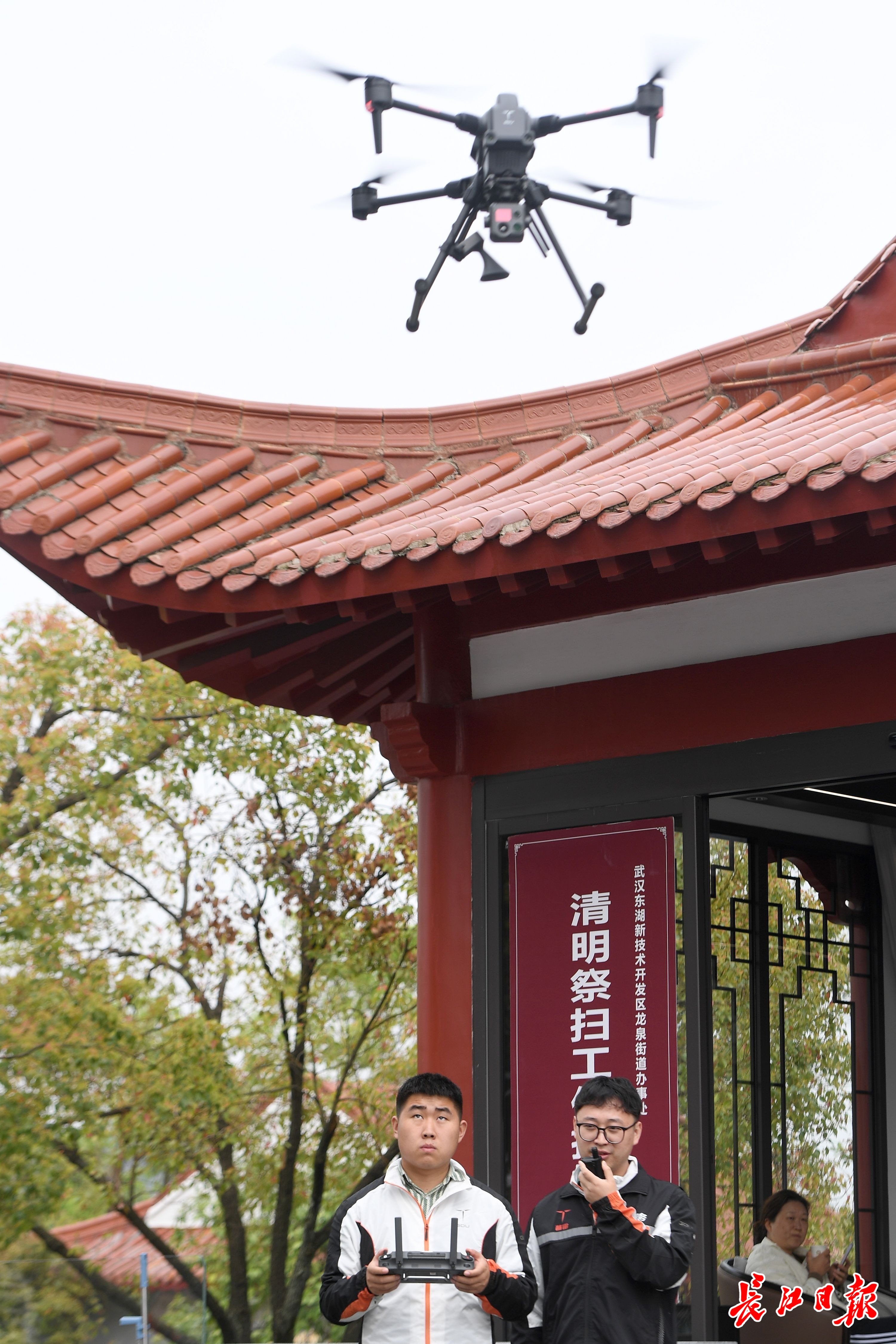 4月5日,飞手操控无人机从位于东湖高新区的孝恩园起飞,实时监测道路交通及祭扫情况。 记者周超 摄