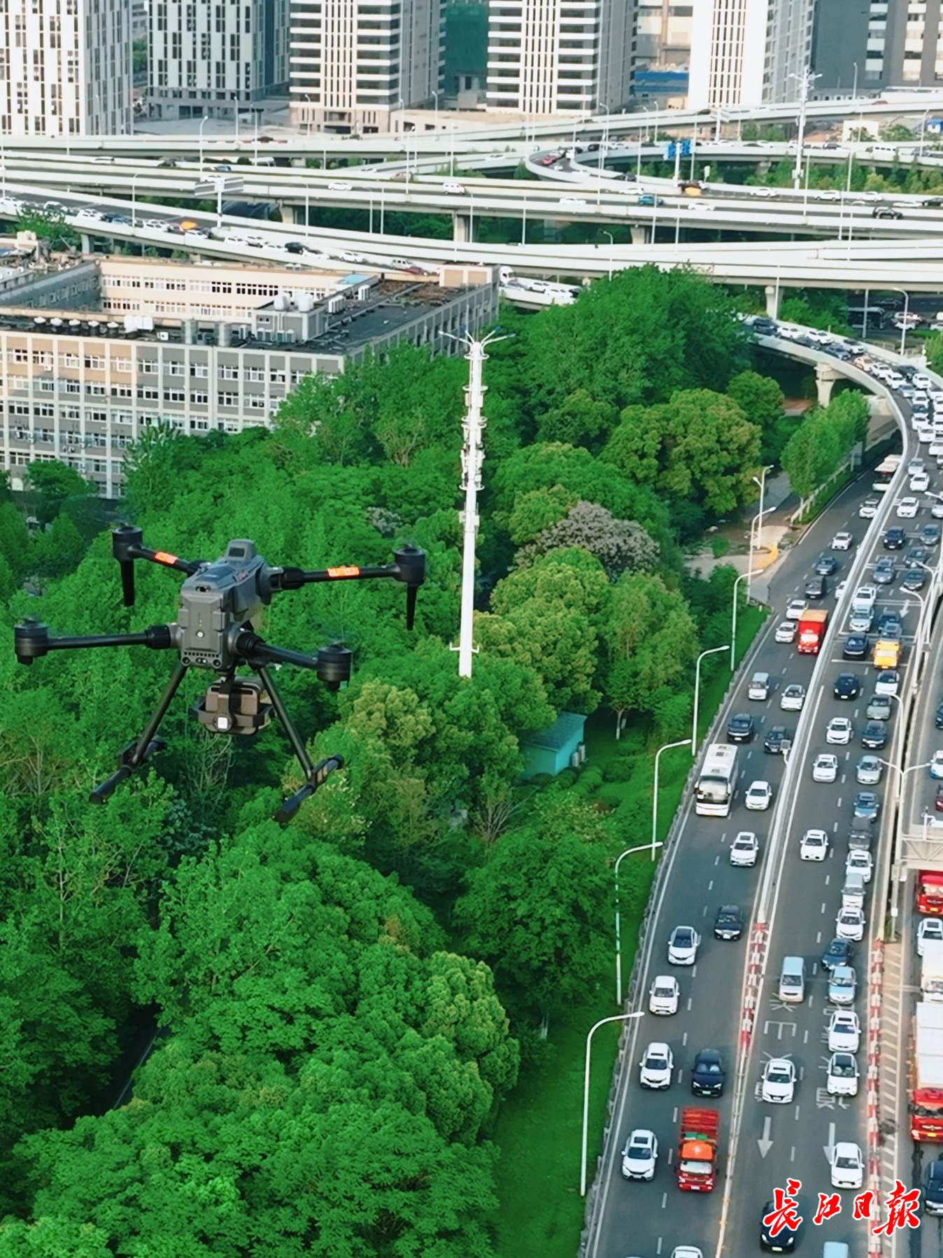 每天在高新大道、光谷大道等主干道上空,无人值守的无人机“按时上班”,车流量、拥堵、违停等交通信息被实时抓取,发送到了东湖高新区交通大队的指挥中心。 记者周超 摄