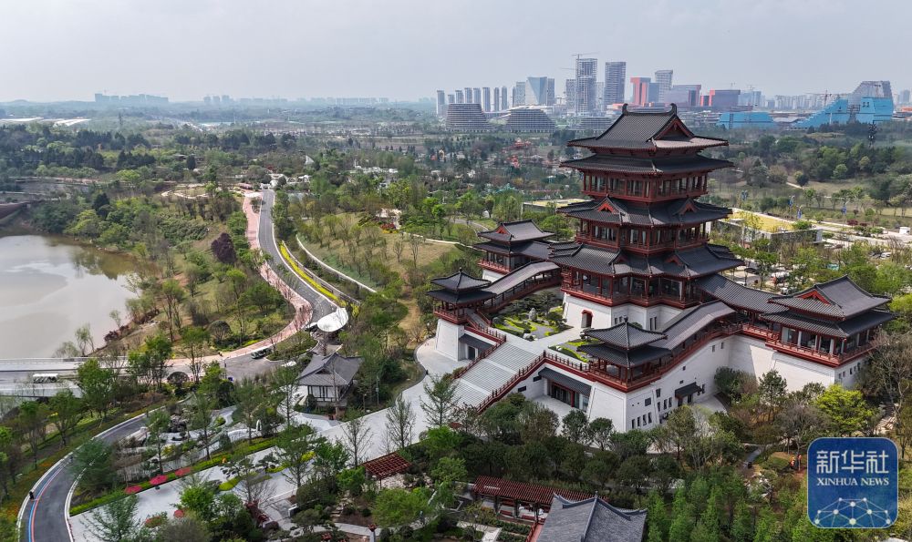 ↑成都世园会主会场里的锦云楼(4月12日摄,无人机照片)。新华社记者 王曦 摄