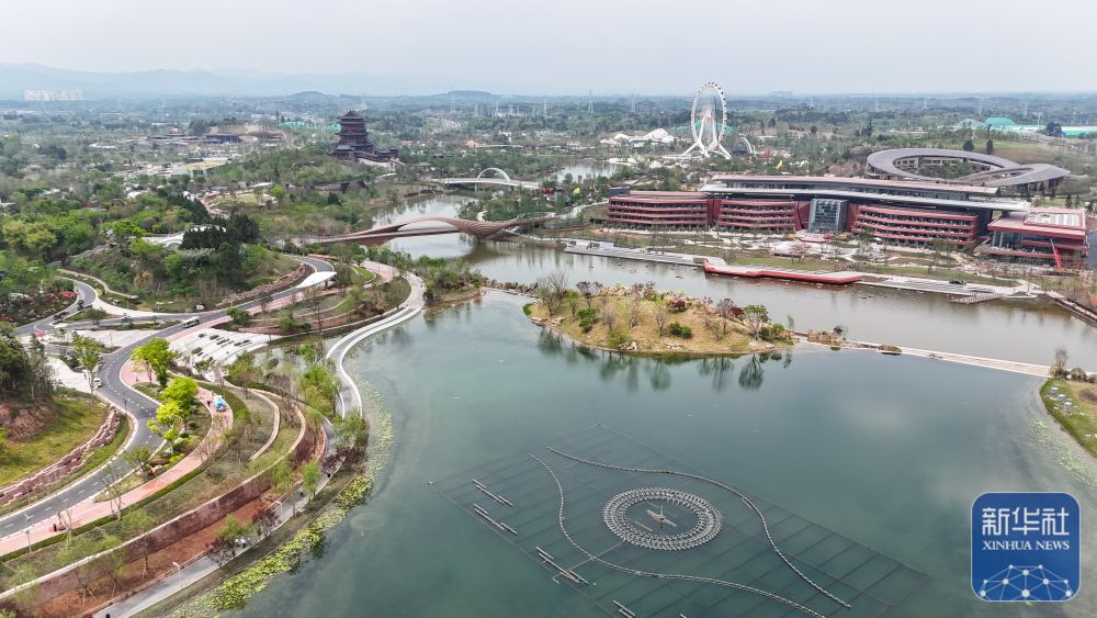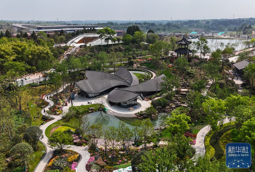 ↑成都世园会主会场一角(4月12日摄,无人机照片)。新华社记者 王曦 摄