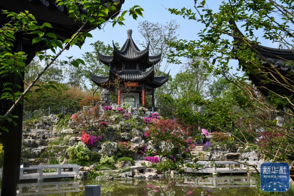 ↑成都世园会主会场里的南京园一景(4月12日摄)。新华社记者 王曦 摄
