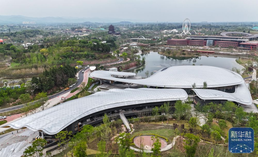 ↑成都世园会主会场里的主展馆(4月12日摄,无人机照片)。新华社记者 王曦 摄