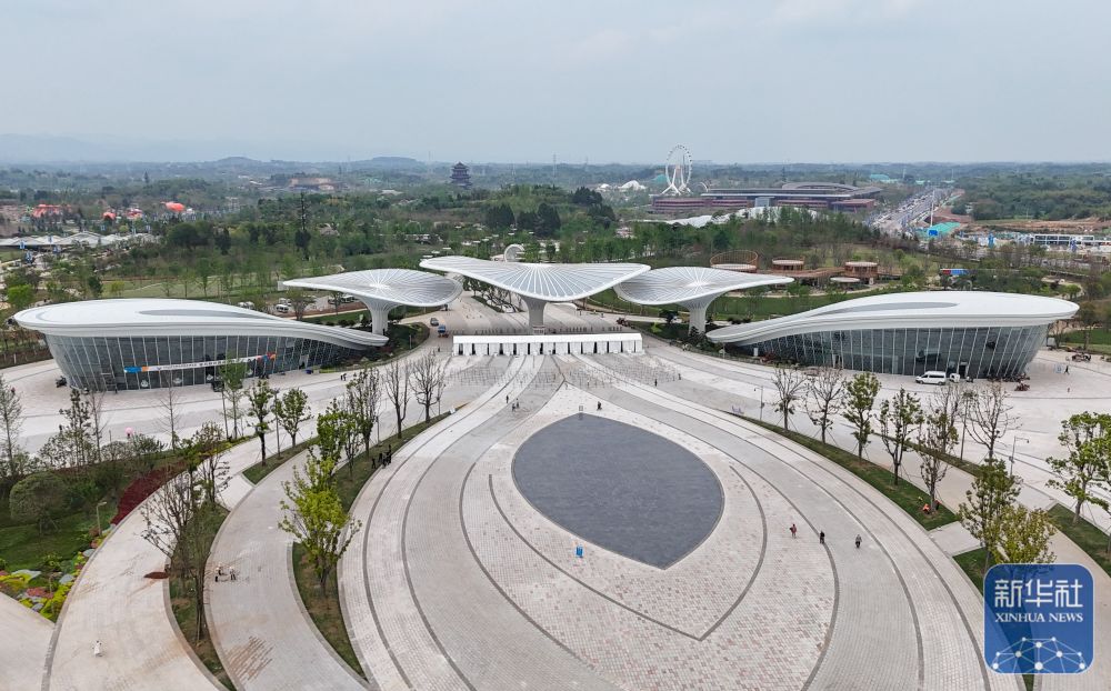 ↑成都世园会主会场入口(4月12日摄,无人机照片)。新华社记者 王曦 摄