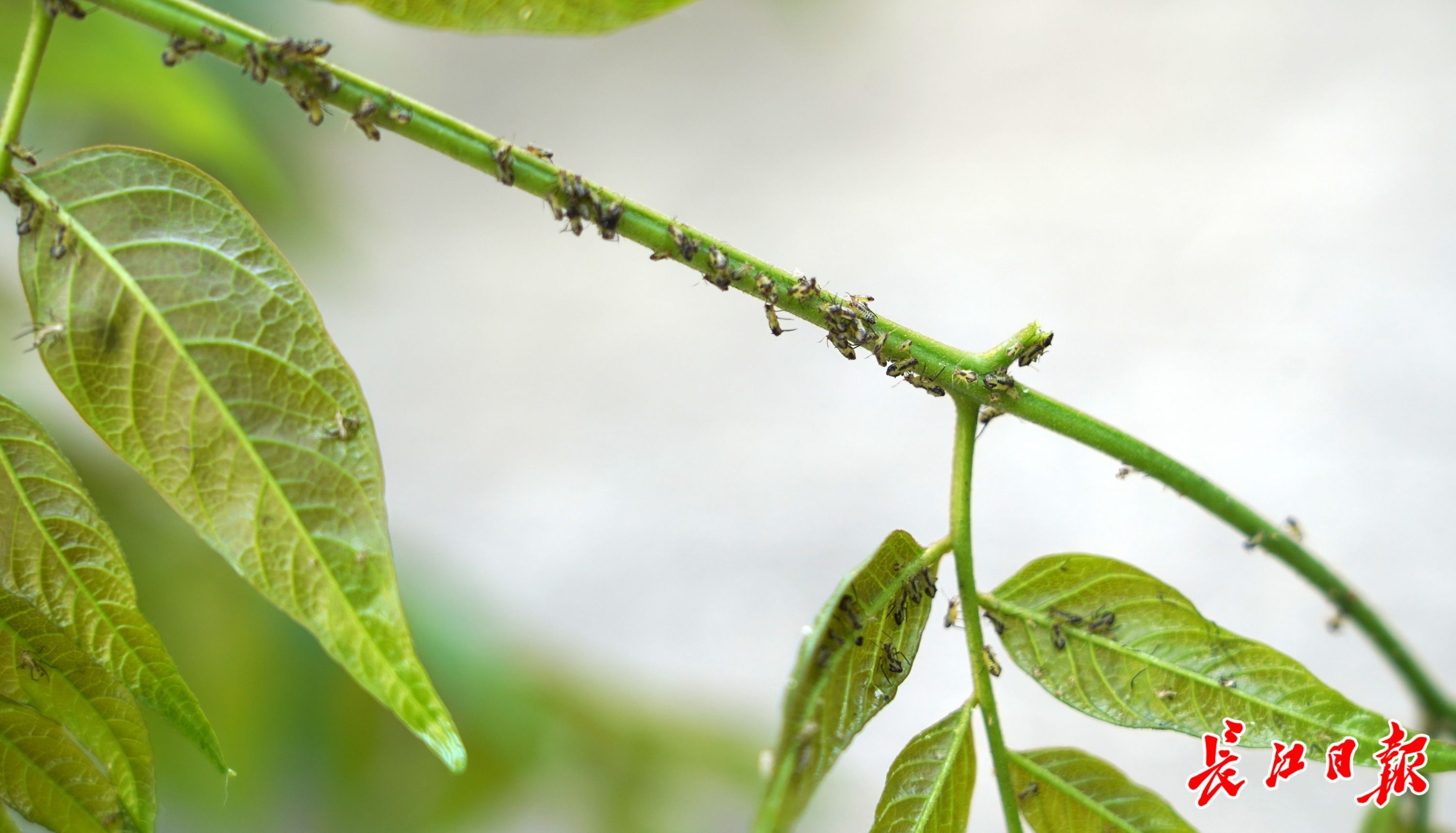 园林工人又锯下一截树枝,冯威检查发现,树叶背面的蚜虫,有的正用尖嘴吸食叶汁,有的在枝叶间往来穿梭。