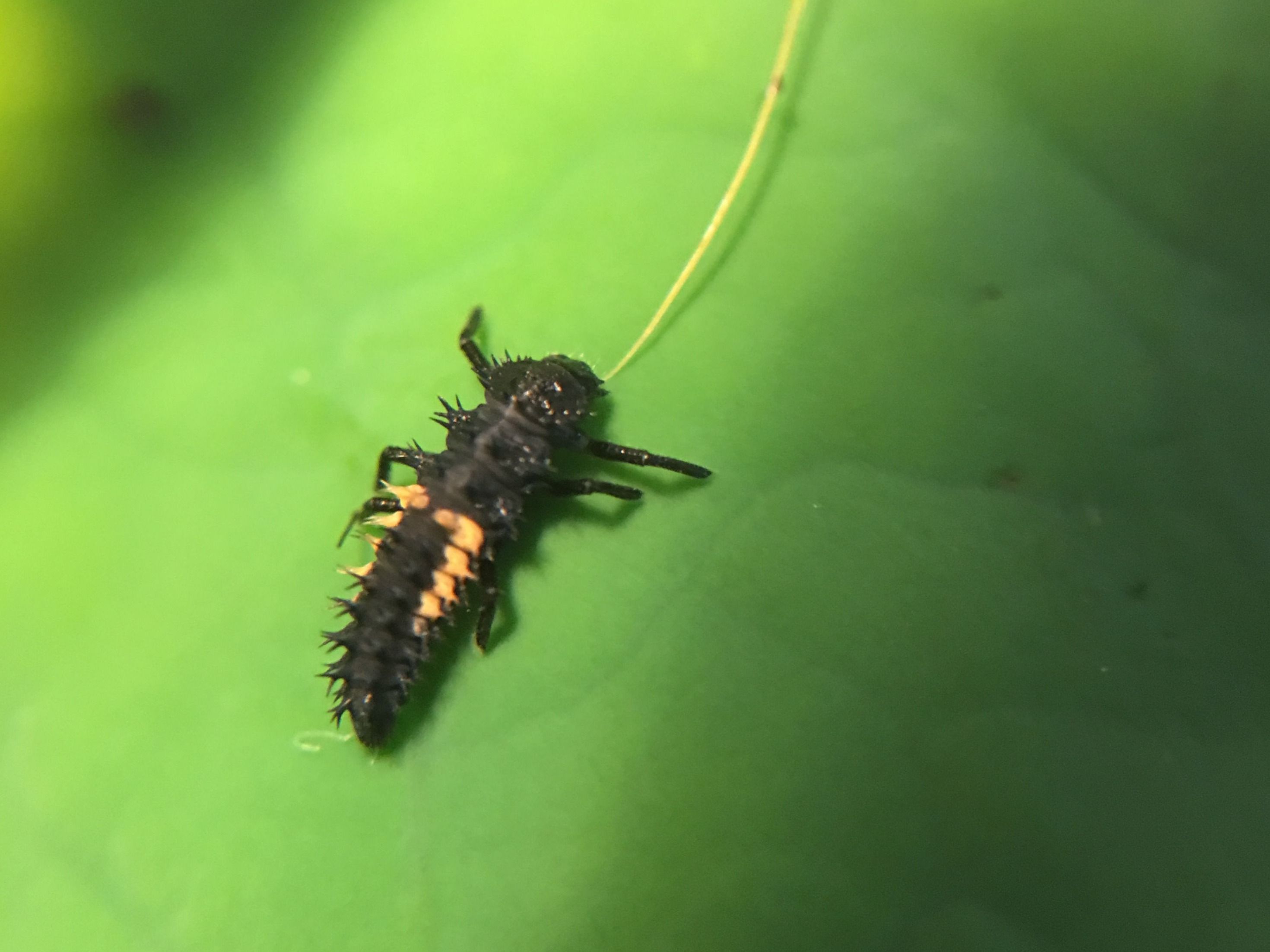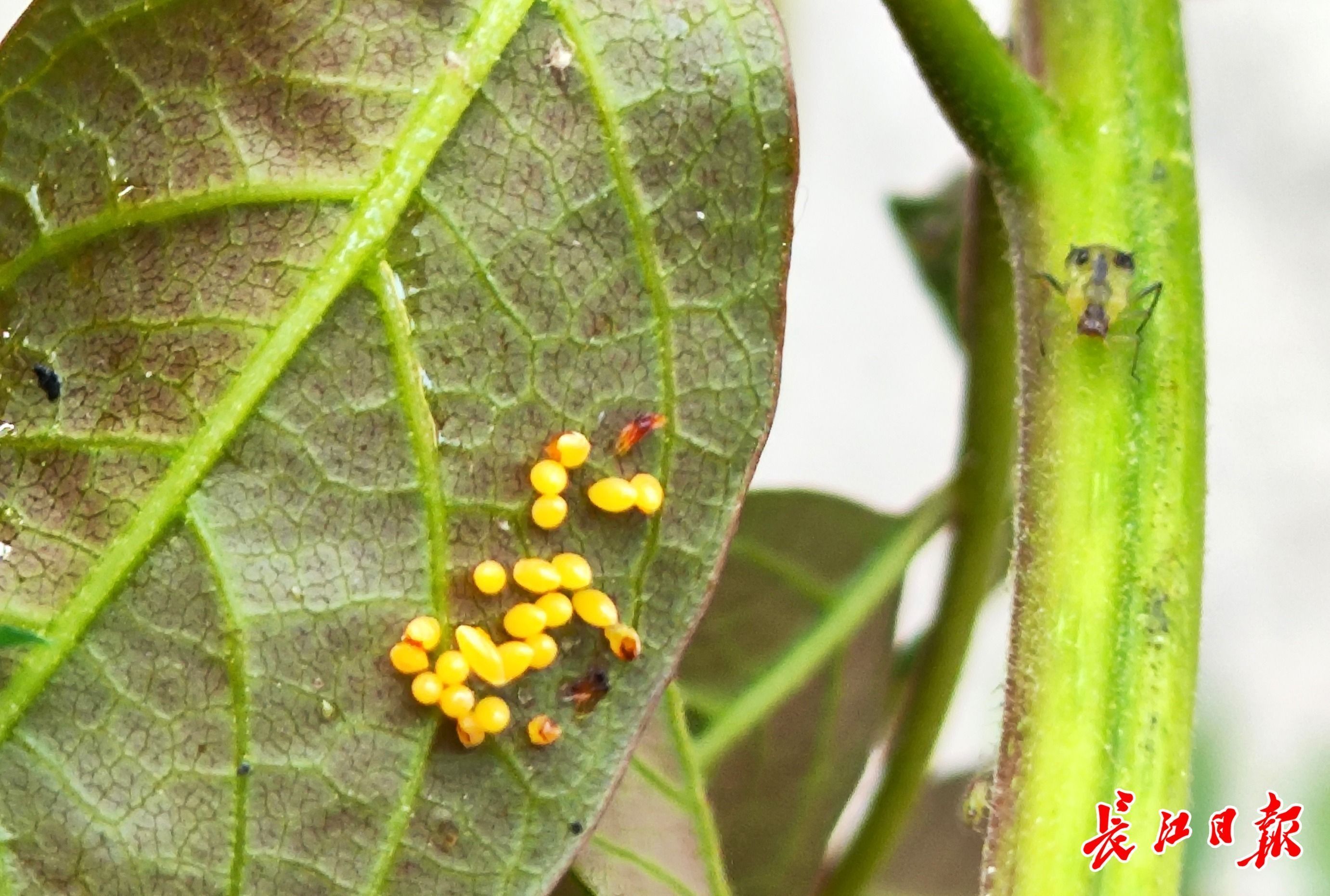 除了蚜虫,树叶上还发现了异色瓢虫的幼虫,以及野生异色瓢虫产下的黄色虫卵。
