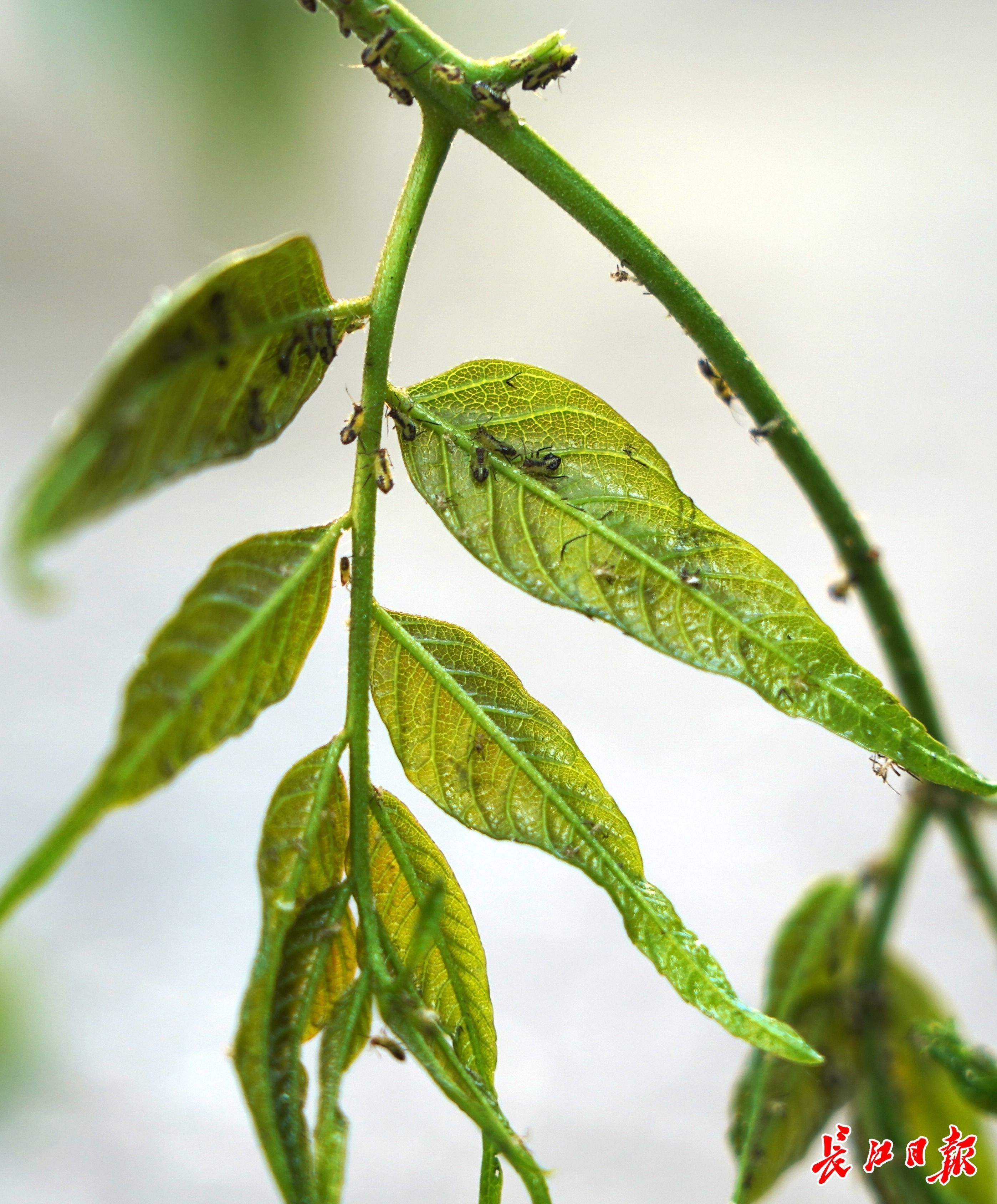 4月12日下午,长江日报记者在汉阳区下马湖路看到,道路两侧的行道树栾树,已有栾多态毛蚜活动的迹象。