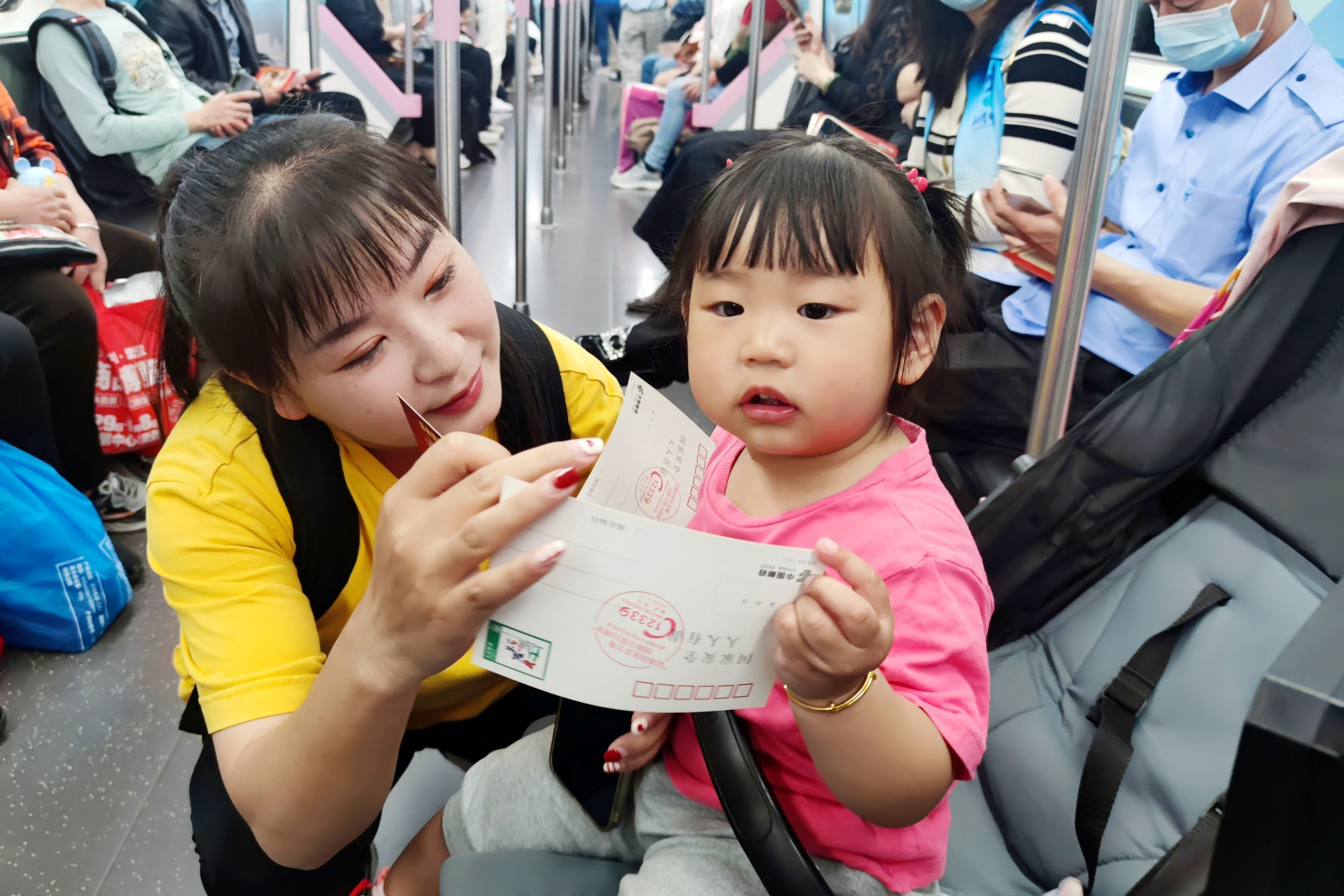 “国安号”地铁专列上,市民拿着领到的国安明信片带着孩子一起认识国家安全。
