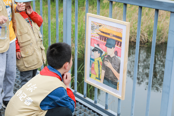 学生驻足欣赏以国家安全为主题的画作。