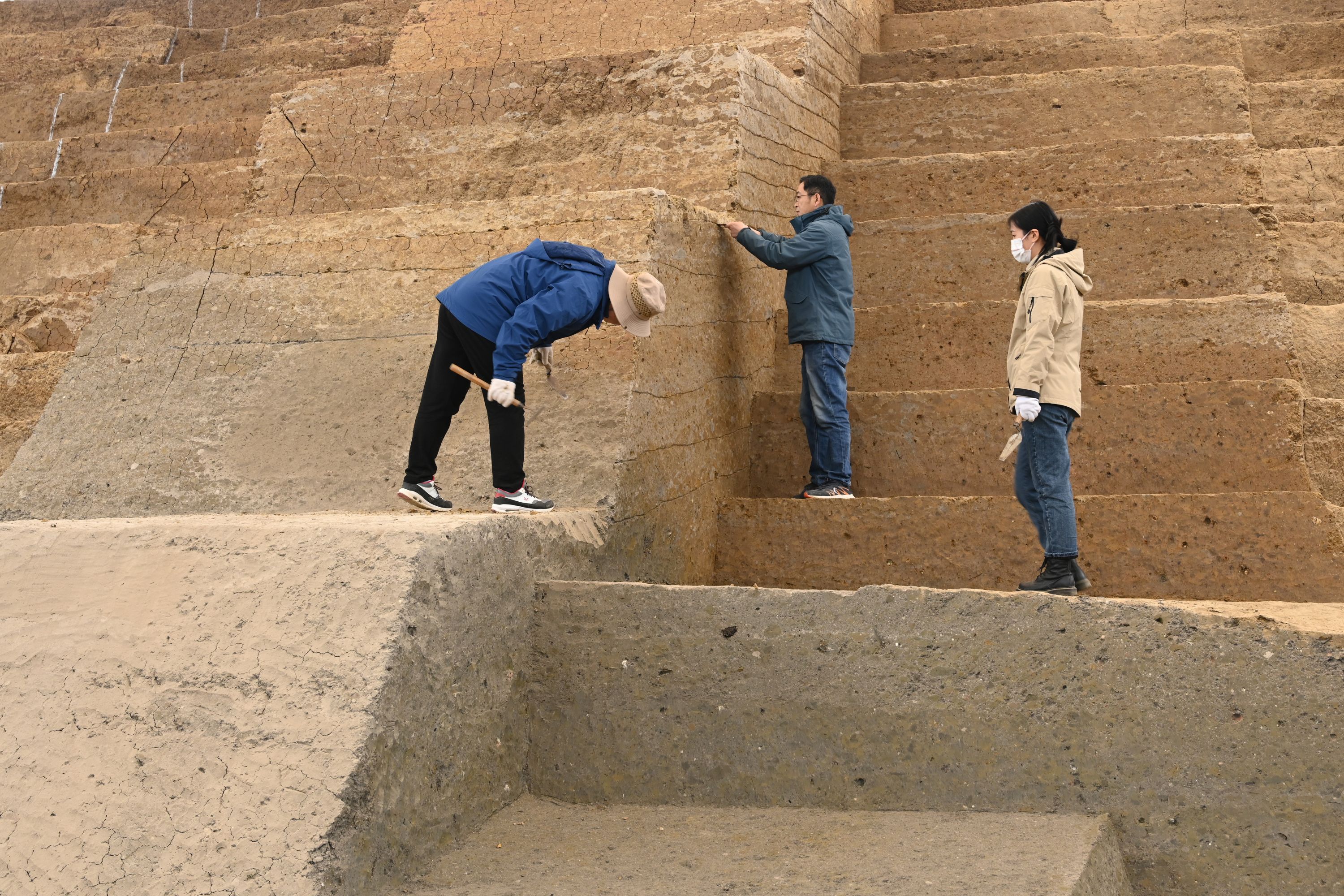 考古工作人员在给填土夯层划地层线。