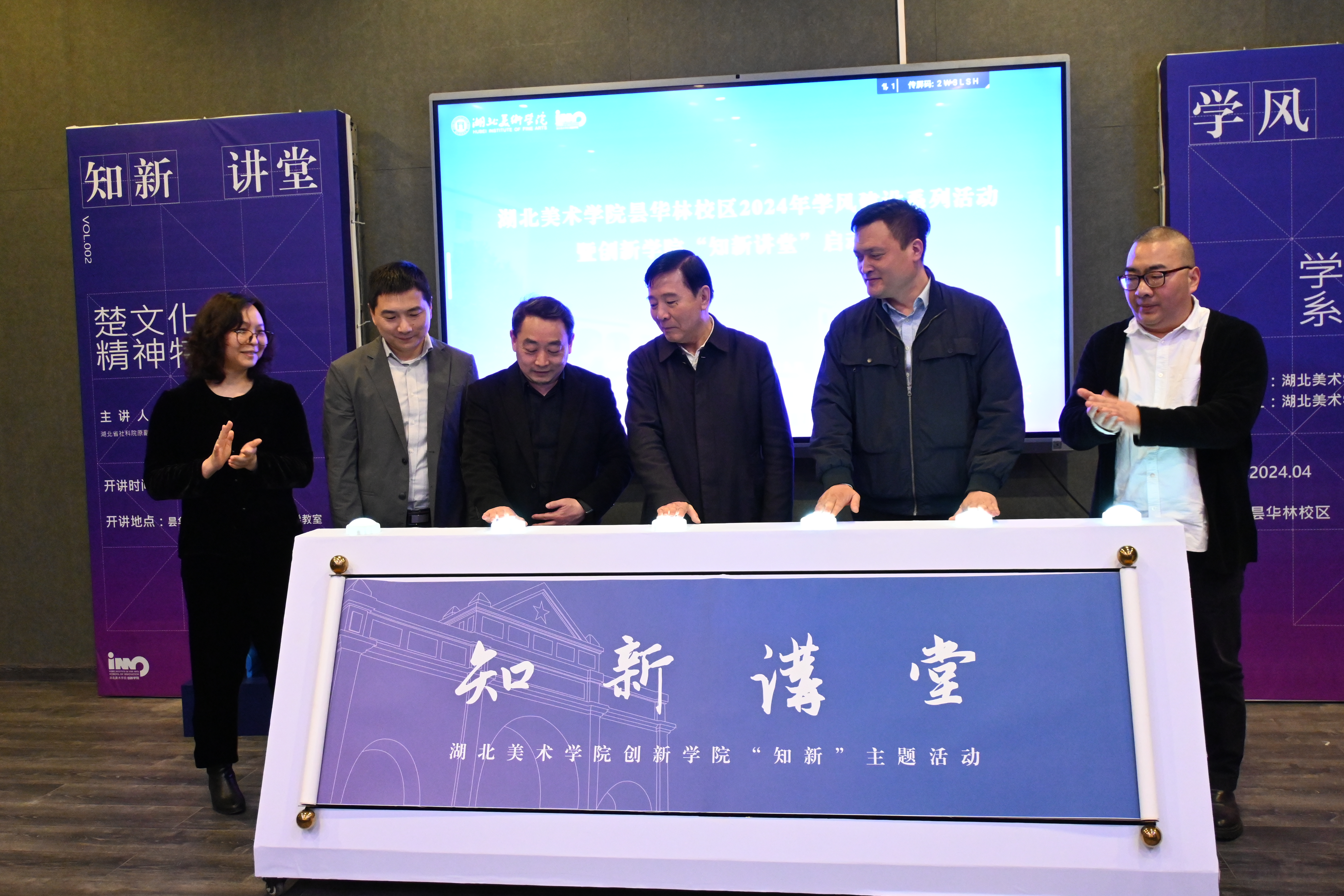 湖北美术学院校党委副书记、校长周峰(左三)与现场嘉宾共同开启“知新讲堂”。通讯员黄传健供图