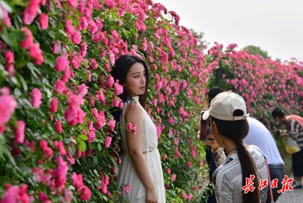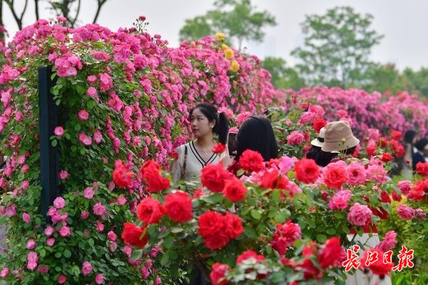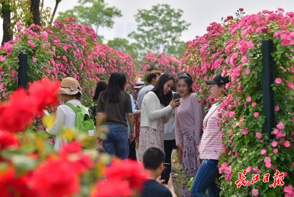 4月21日,武汉市金银湖月季花园里,100余种藤本月季、丰花月季、微型月季灿烂绽放,形成一道道花廊和一片片花海,吸引了众多市民、游客前来赏玩。