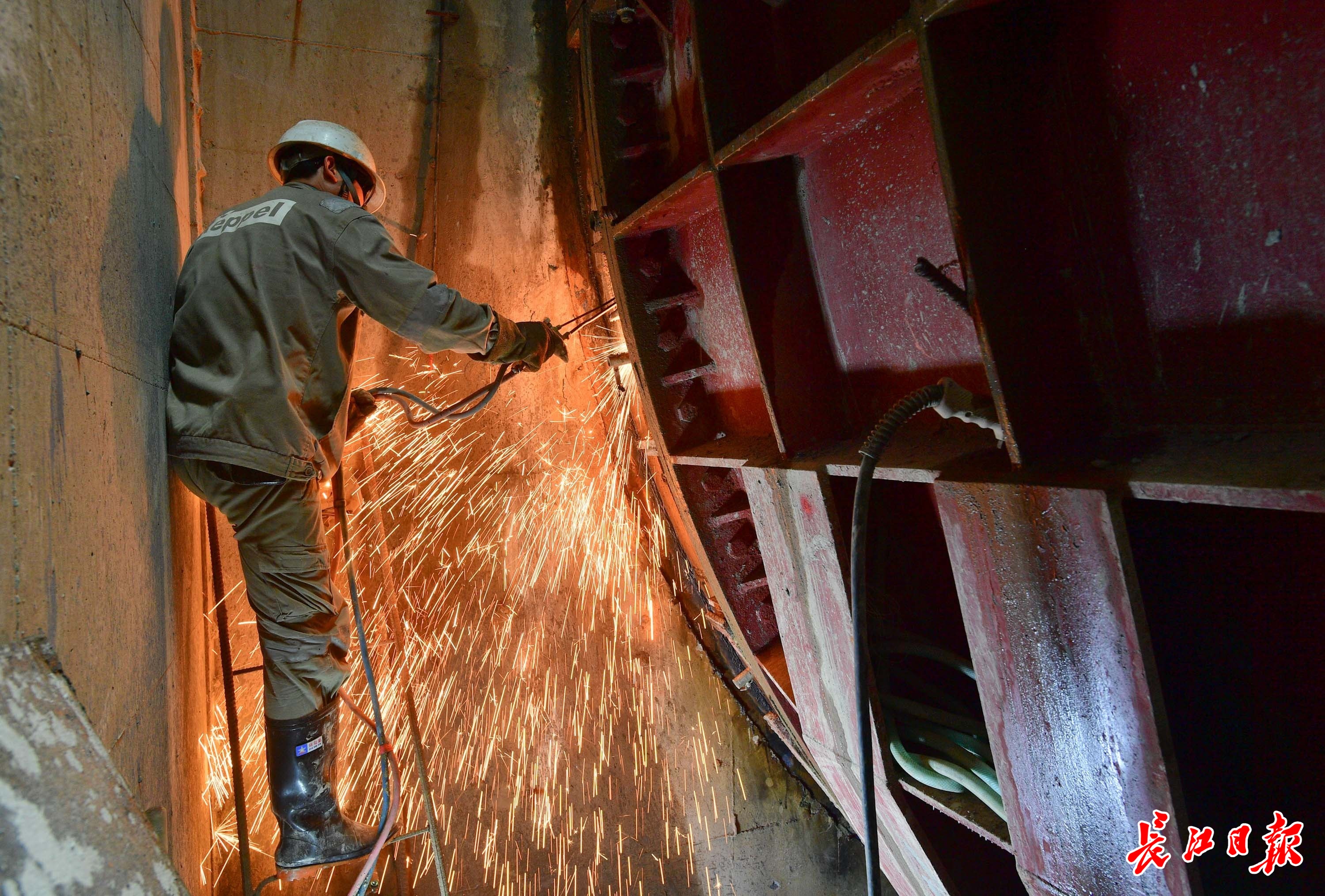 现场,施工人员正在焊接密封洞门,密封完成后开始拆除钢套筒。22日,施工人员完成铜套筒拆除施工,盾构机顺利出洞。