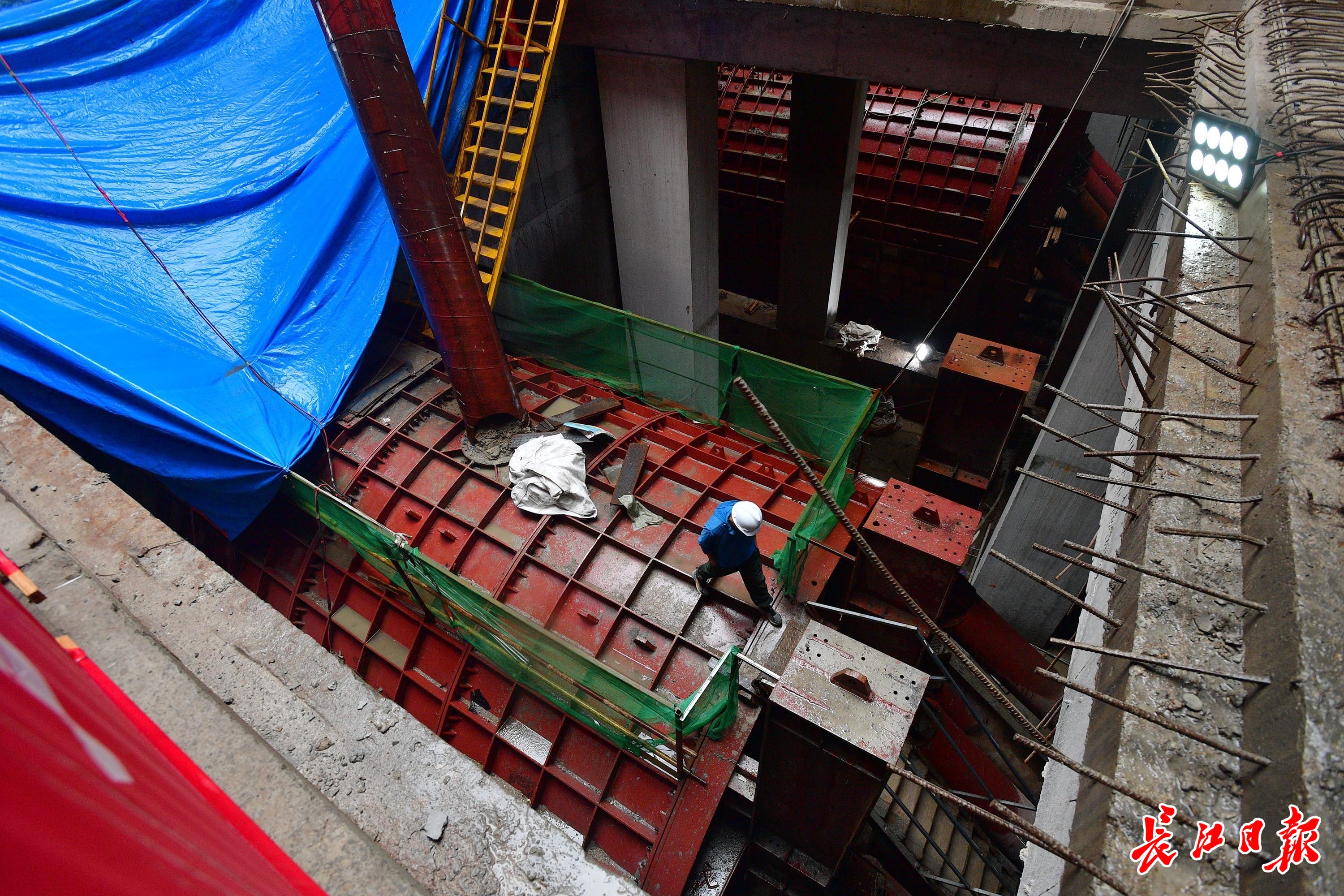 17日上午,记者在位于汉阳区的四新南路站看到,与其他盾构接收不同,在车站底部,一个巨大的钢套筒与隧道洞口连接,约20米长。此时,盾构机已经完成掘进,正在洞门后面“待命”。