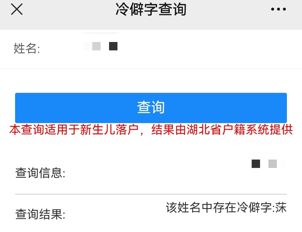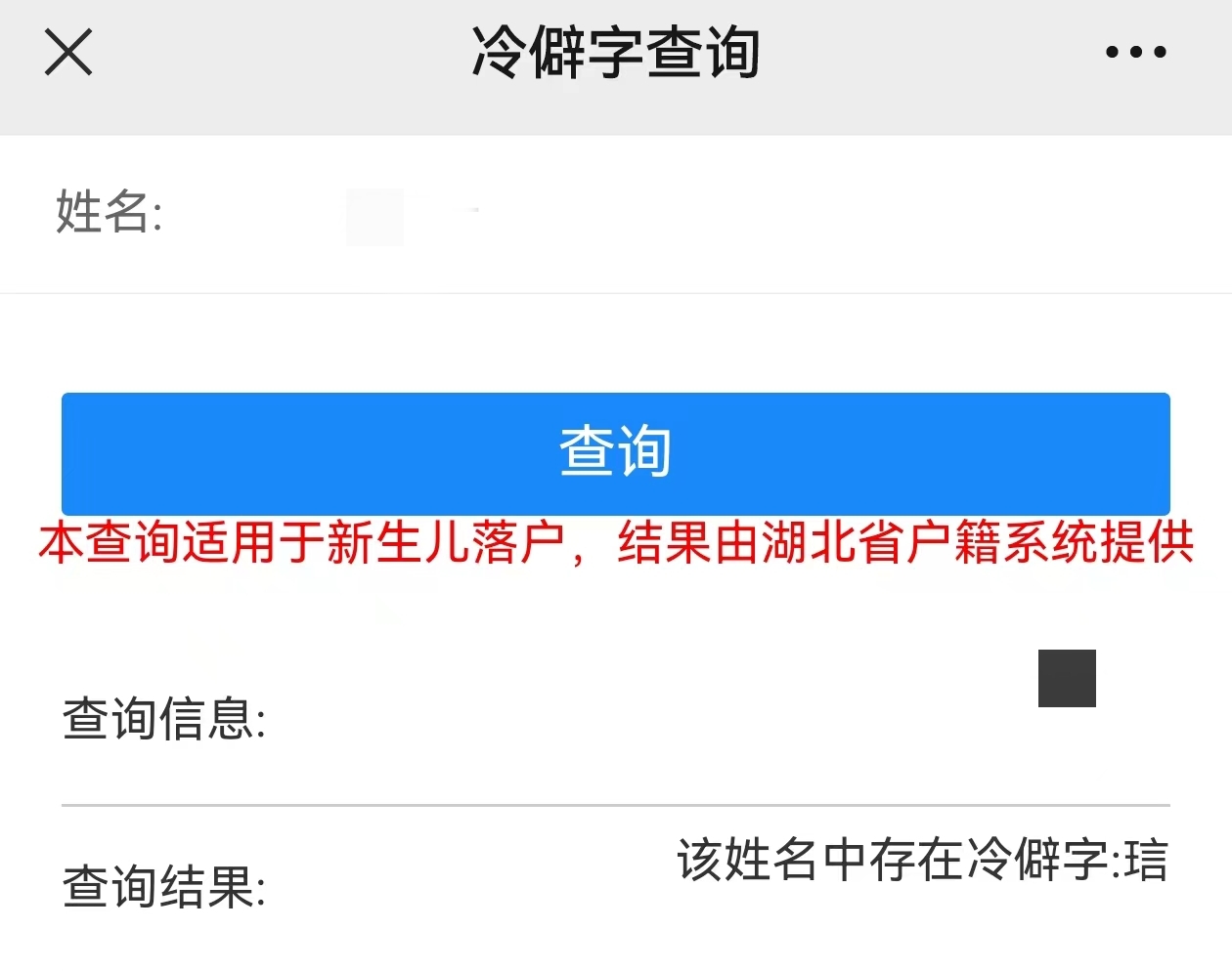 记者登录该平台,使用“小红书”上推荐的“琂”“莯”“莀”等字查询,系统会提示“该姓名中存在冷僻字”。而使用正常姓名查询,结果则显示“该姓名不存在冷僻字,符合户口办理条件”。