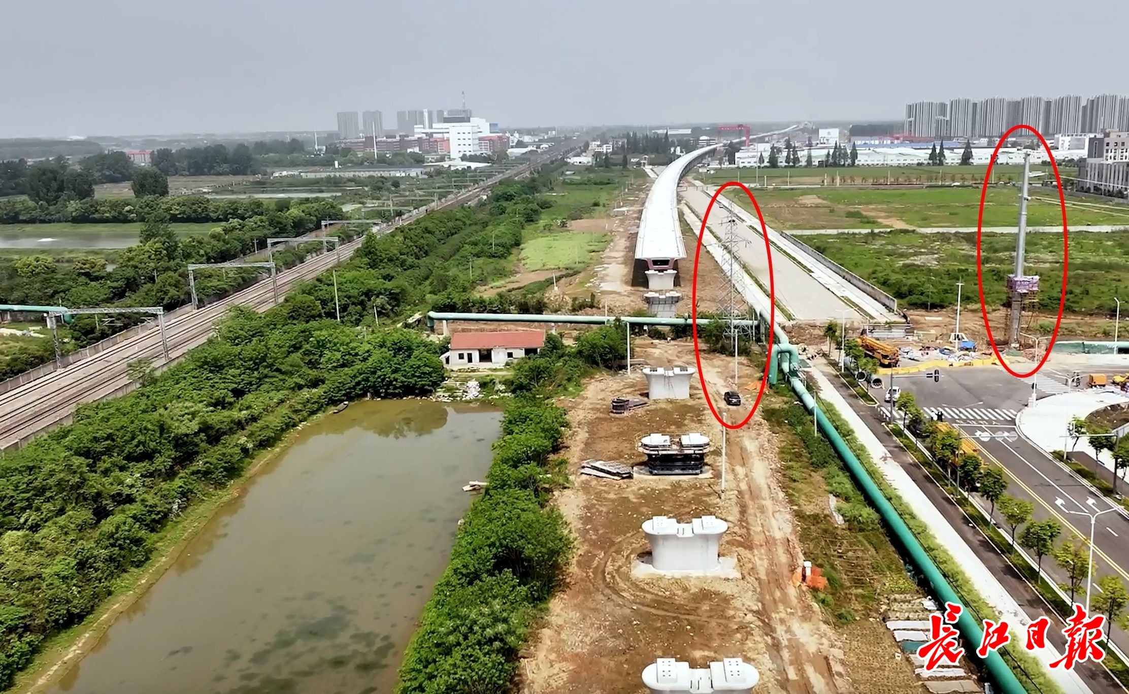 电缆“钻入”地下,从新建地下通道中穿出,再牵引到30米高的线塔上(图右画圈处),沿着新的线路延伸到远端。