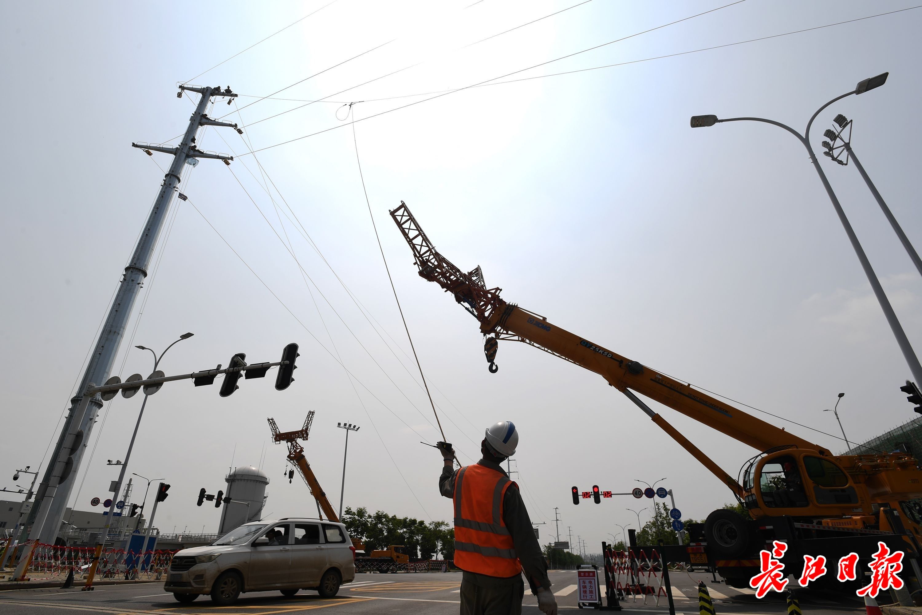 23日,东西湖区兴工六路上,国网武汉供电公司沿江高铁高压电力迁改工程正在紧张施工。