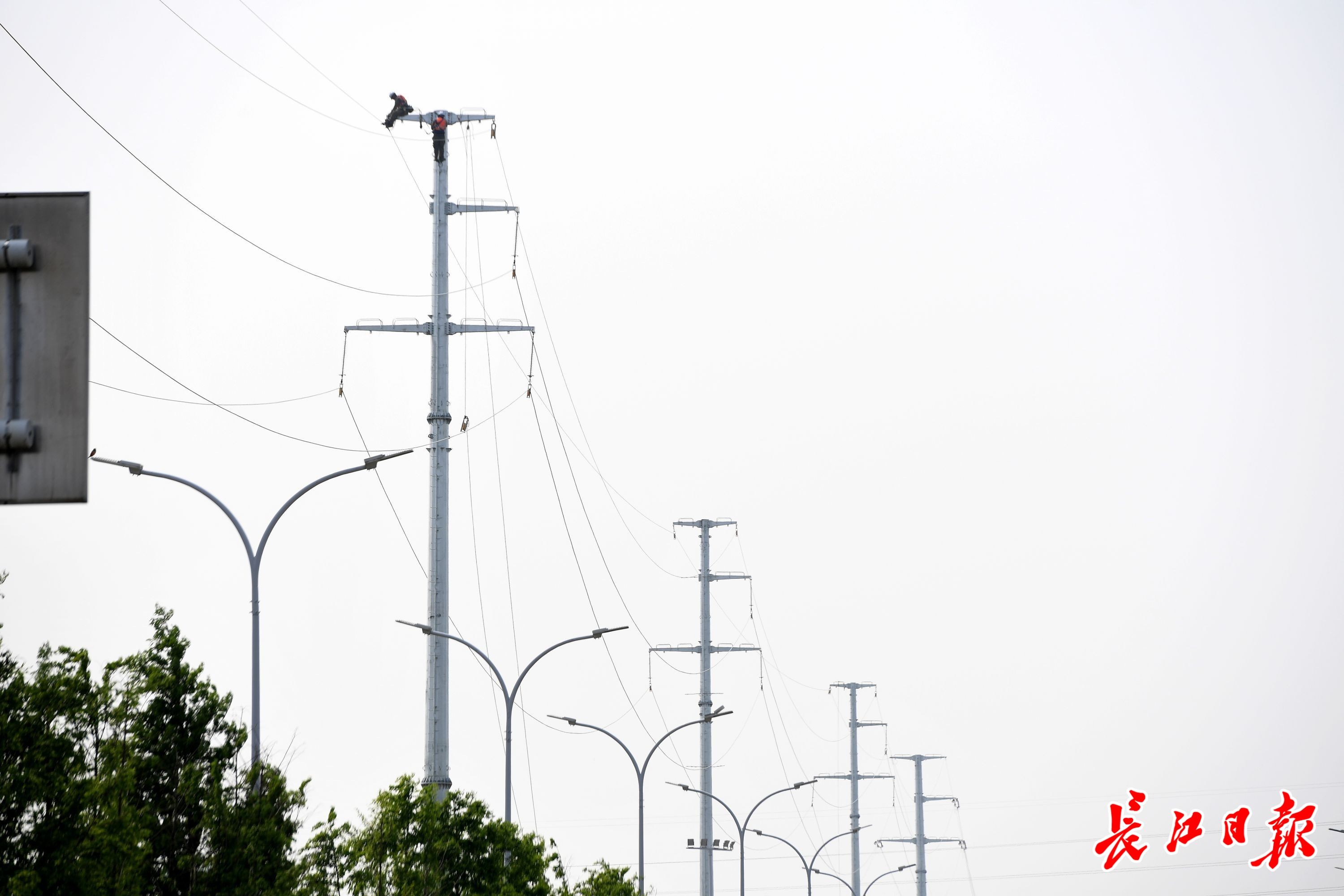 长江日报大武汉客户端4月24日讯 城郊大道边,一根根锃亮的线塔立了起来,整齐成行,串联起一条全新的供电线路通道。4月23日,为给建设中的沿江高铁武宜段项目“让道”,东西湖区兴工六路上,国网武汉供电公司沿江高铁高压电力迁改工程正在紧张施工。