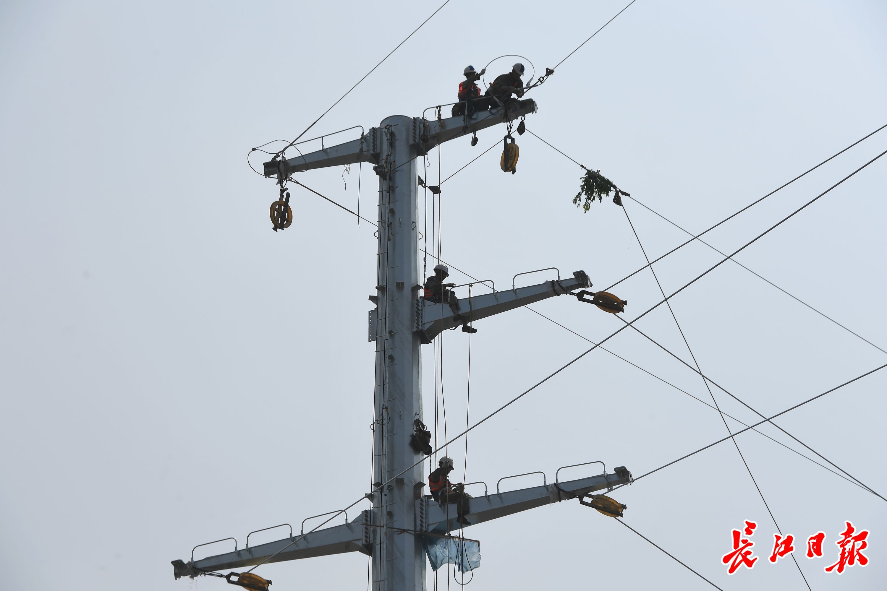 迁改现场,长江日报记者看到,兴工六路上,沿江高铁高架铁路附近,随着110千伏荷绵一回线路迁改工程实施,一股股电缆“钻入”在建铁路地下,从新建地下通道中穿出,作业人员用牵引机,将导线牵引到30米高的线塔上,沿着新的线路延伸到远端。