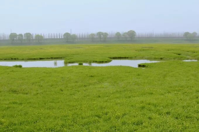 府河是季节性河流,到了秋冬季节河床裸露像一片大草原。一望无际的绿,堤岸边挺拔的白杨,嫩绿的翠柳,像一个城市里的世外桃源。