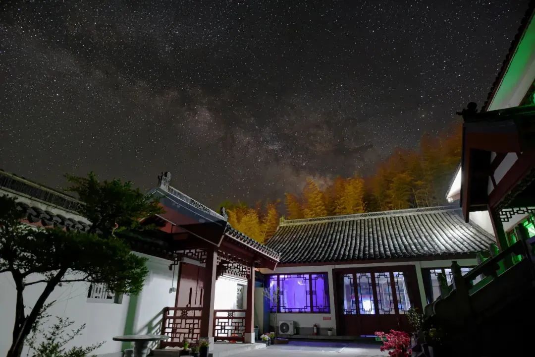 在这里还能看到最美星空。夕阳缓缓西下,于湖边远眺,一轮皎皎明月已然悬挂于空中。三五好友,围坐于湖边茶台,煮上一壶香茗,迎着拂过山岗的清风,任凭竹林的香气萦绕鼻尖,畅谈人生。当夜幕降临,漆黑如墨的天幕上繁星闪烁,宛如璀璨的宝石镶嵌其中。照片着实无法全然展现星空的震撼与美丽。