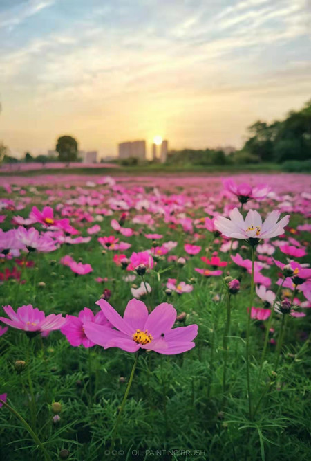 光谷政务中心北侧的公园里,210亩波斯菊开成了一片粉红色的花海。城市摄影队 油画笔 摄