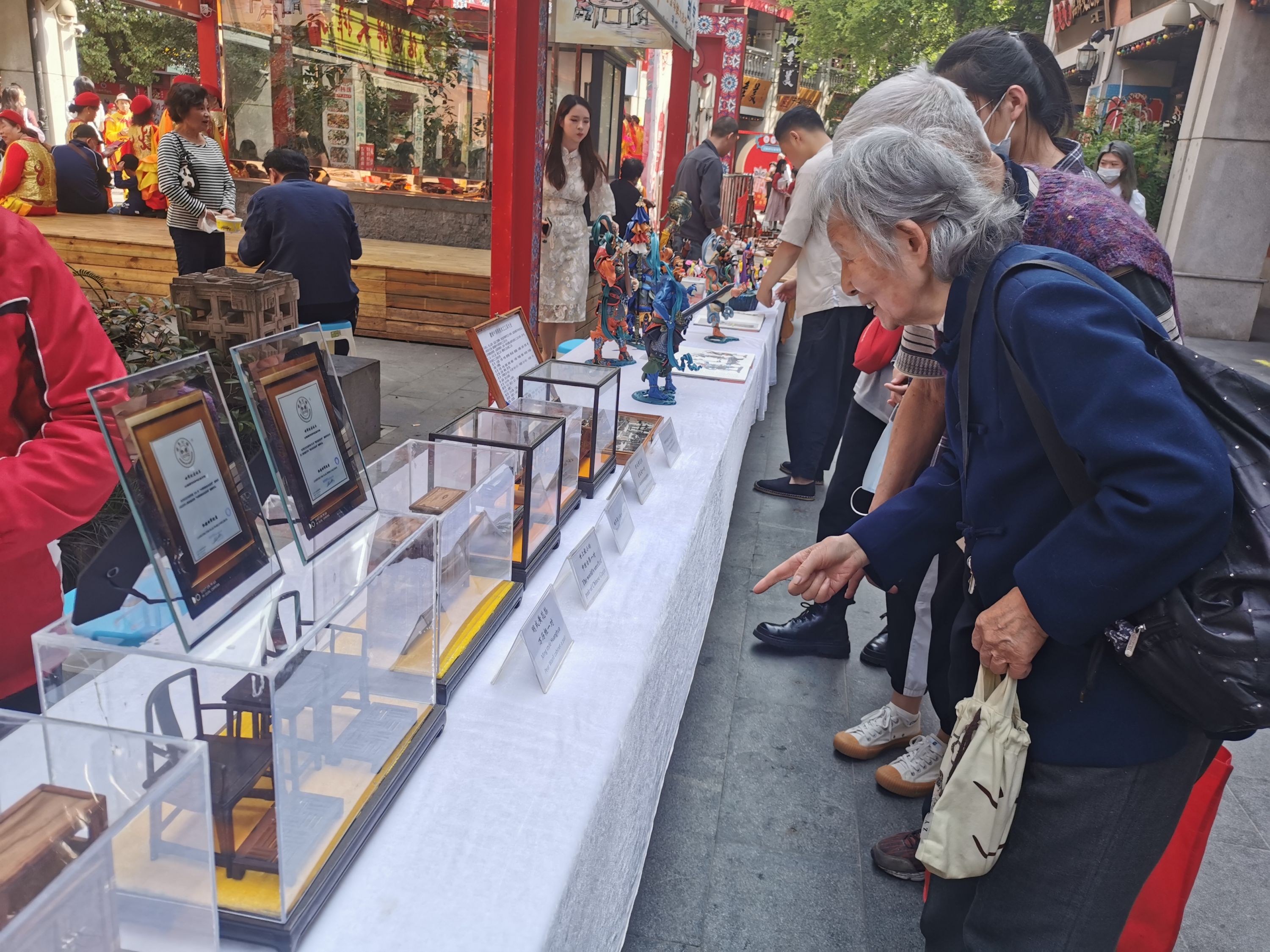 “爷爷,这是您自己做的吗?”家住武昌的市民张先生特地趁着假期带着孩子过来玩,在非遗集市上,小孩子被面前精巧的微缩工艺品吸引。只见摊位上,明式黄花梨官皮箱、圆角柜、山水图插屏,个个手掌般大小,外观和结构格外精致。这是都是非遗传承人沈邦汉疫情以来创作的一批新作品,此次在吉庆街为首次展出。