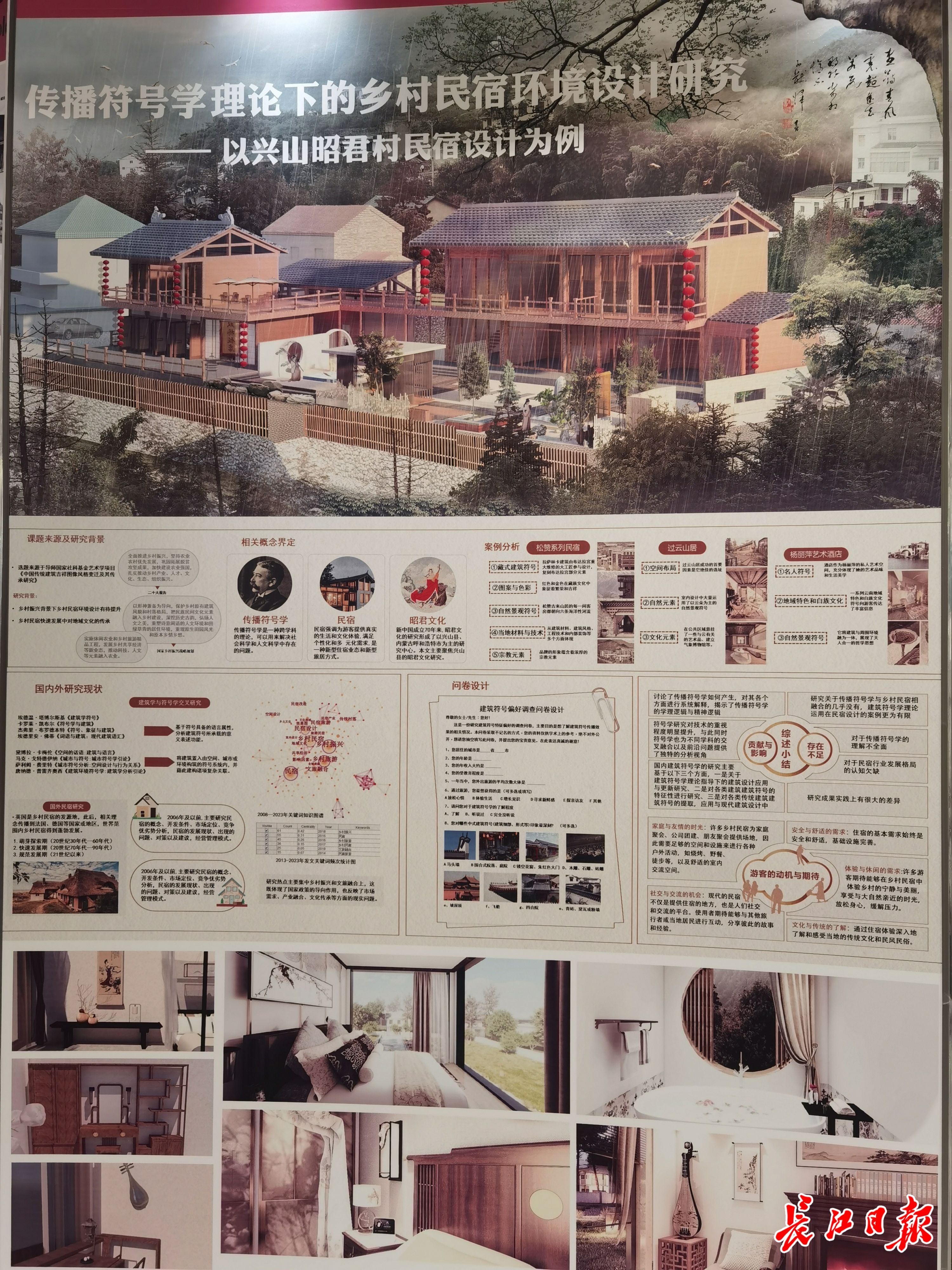 另一名学子文皓月将家乡宜昌兴山昭君村的民宿融入自己的毕业设计。她表示,乡村振兴中的环境治理和乡村旅游与她的专业可以很好地结合,她认为从事环境设计不仅要着眼于行业前沿,更要肩负起乡村环境治理的责任。设计作品上的地点是她小时候经常游玩的地方,她希望通过设计乡村民宿为改善居民生活质量和促进乡村经济发展贡献一点力量。