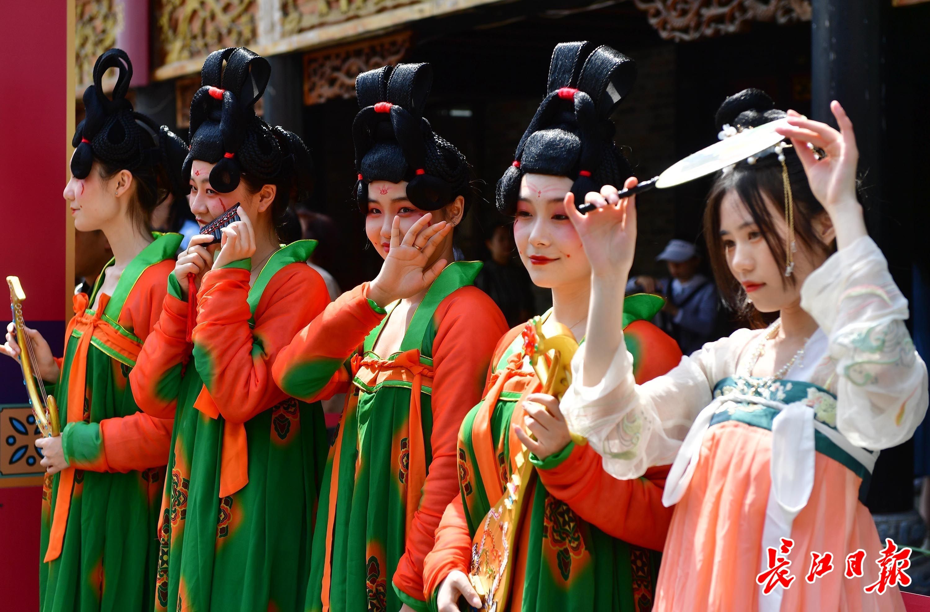 园博园汉口里,一群小姐姐身着“红绿黄”配色的服装,画上唐代时尚妆容“斜红”巡游,与游客互动游戏。不少游客也身着汉服游园。 详见>>