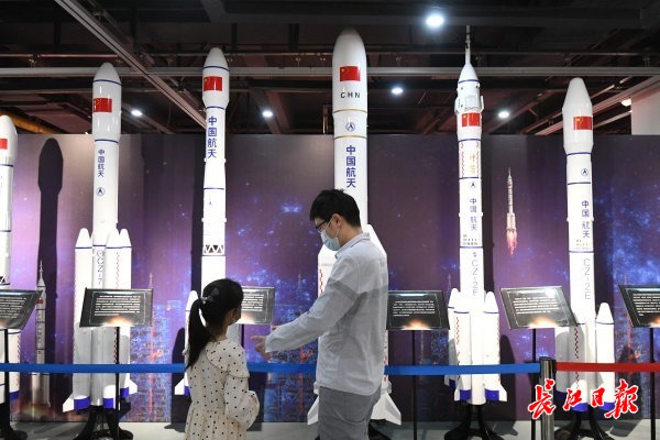 除了在户外游玩,也有不少家长带着孩子来到武汉科技馆,宇宙展厅里的中国“天宫一号”宇宙空间站模型吸引了众多市民和游客驻足观赏。武汉科技馆举办的“少年强国太空筑梦”航天科普特展上,展出的长征五号运载火箭和中国空间站模型,让前来的游客大饱眼福,也深刻地了解了中国的航天历程,爱国豪情油然而生。(长江日报记者苗剑 彭年 周超 詹松 通讯员谭琛 摄影报道)