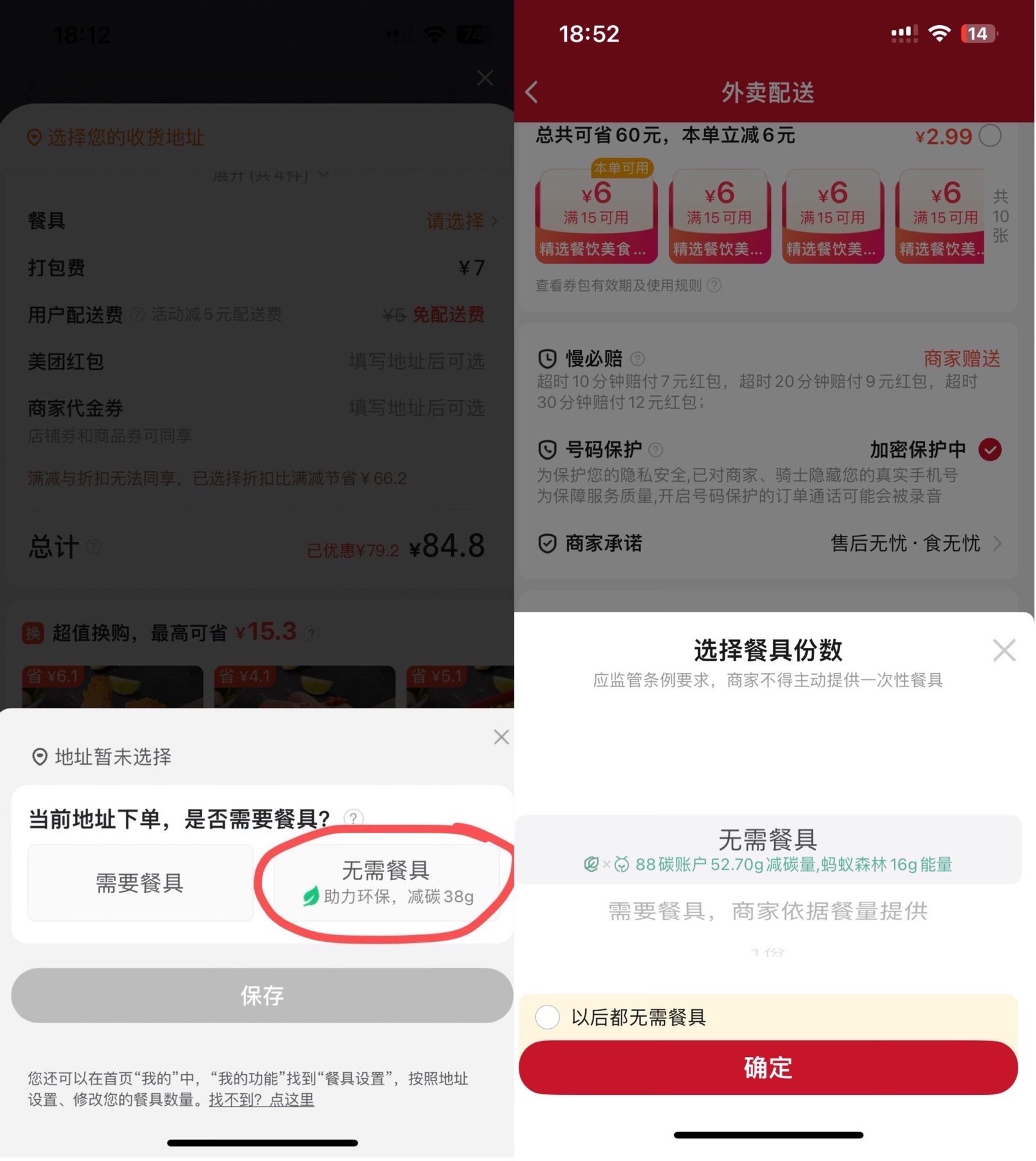 记者在饿了么和美团的下单页面看到,“是否需要餐具”在2个外卖平台都是消费者的必选项。美团的“无需餐具”选项下有一行小字:“助力环保,减碳38g”;饿了么的该选项下也有一行绿色小字:“88碳账户52.70g减碳量,蚂蚁森林16g能量”,并配有一行提醒:“应监管要求,商家不得主动提供一次性餐具”。