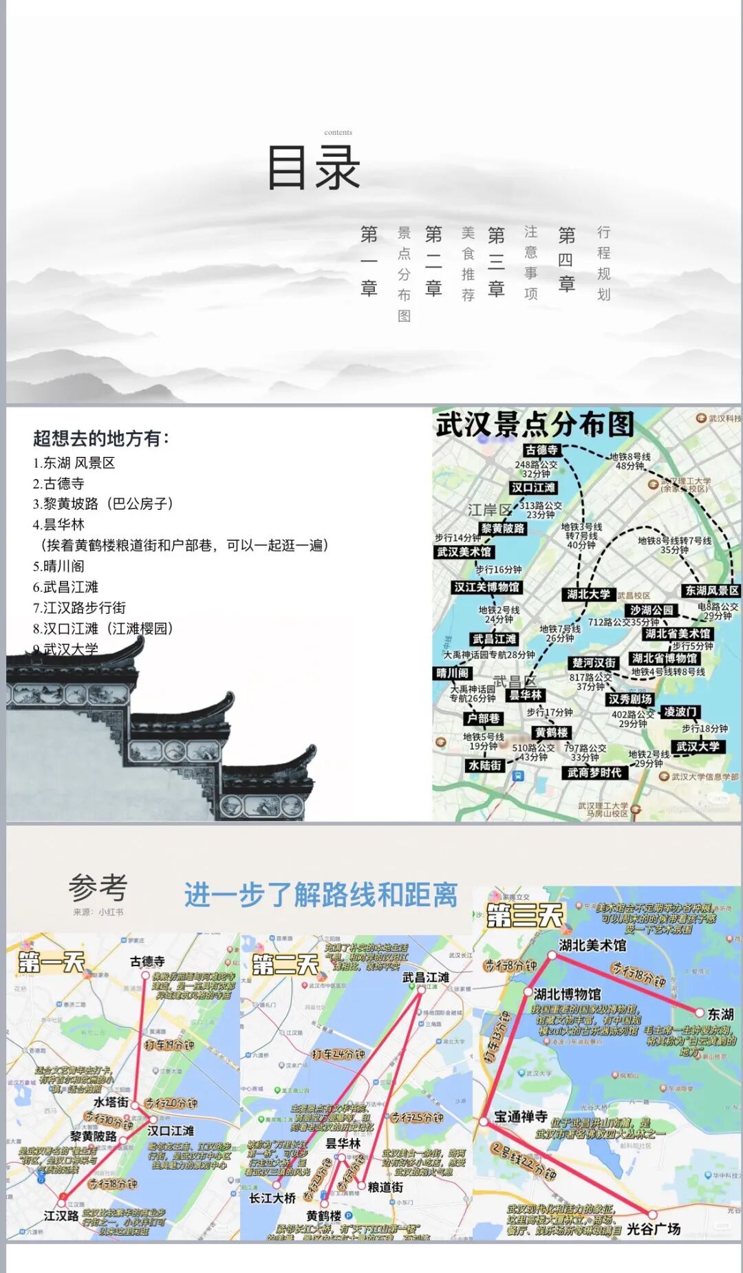 为了这趟武汉之行,我可是早早做了准备,还特意花了五六个小时用PPT的形式做了一份23页的旅游攻略。这份攻略整合了很多网友的智慧,包括景点分布图、美食推荐、注意事项、行程规划四个章节,每个章节都根据我自身情况做了“特色安排”。比如,我和朋友喜欢拍照,想在美丽的东湖边拍出“人生照片”,我就在网上搜罗了各种在东湖边拍照的姿势以及打卡点推荐;我和朋友都比较爱休闲旅游,我就整理了一些网友体验过的行程规划,主打一个省心省力不费事。