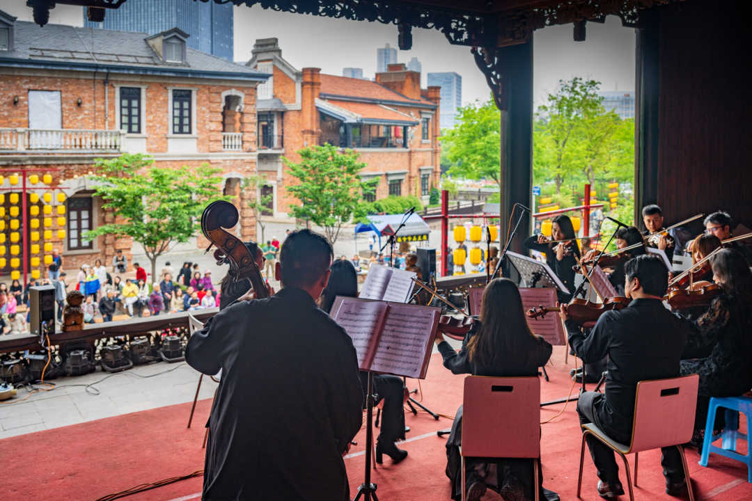 园博园内,游人如织。聆听者与演奏者共同构成一幅美好画卷。