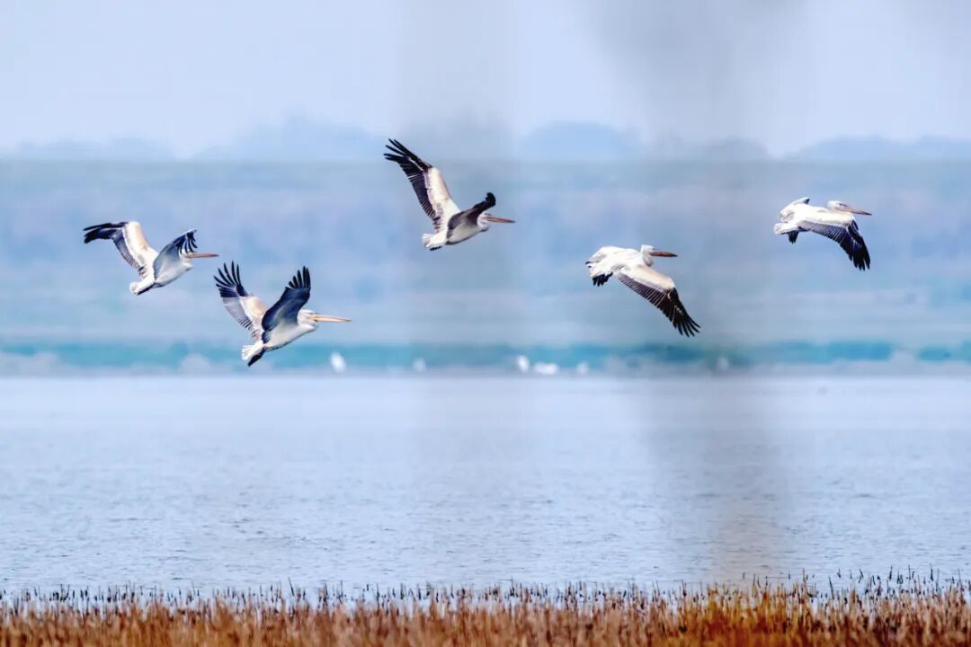 沉湖湿地上空的卷羽鹈鹕。魏斌 摄