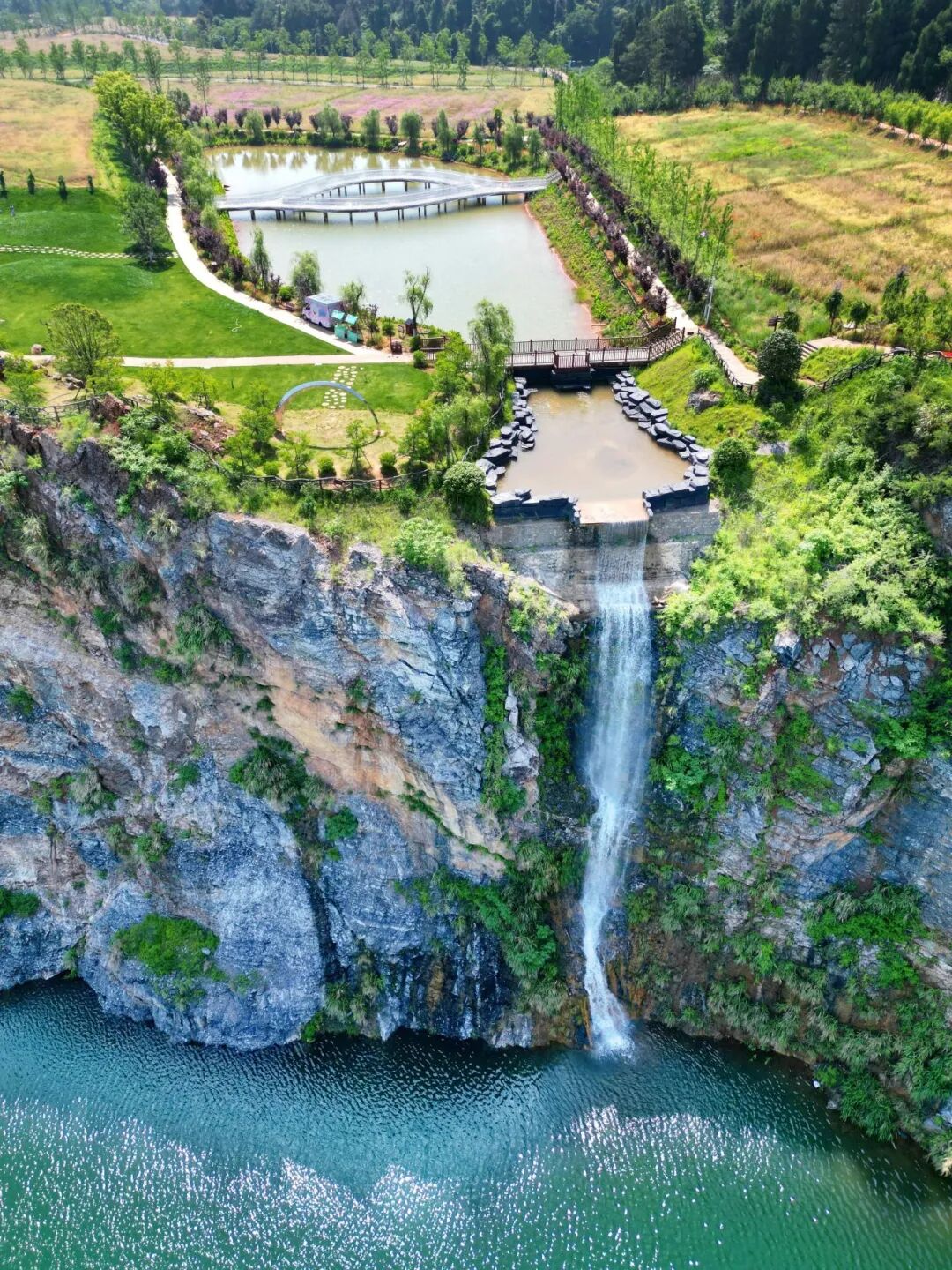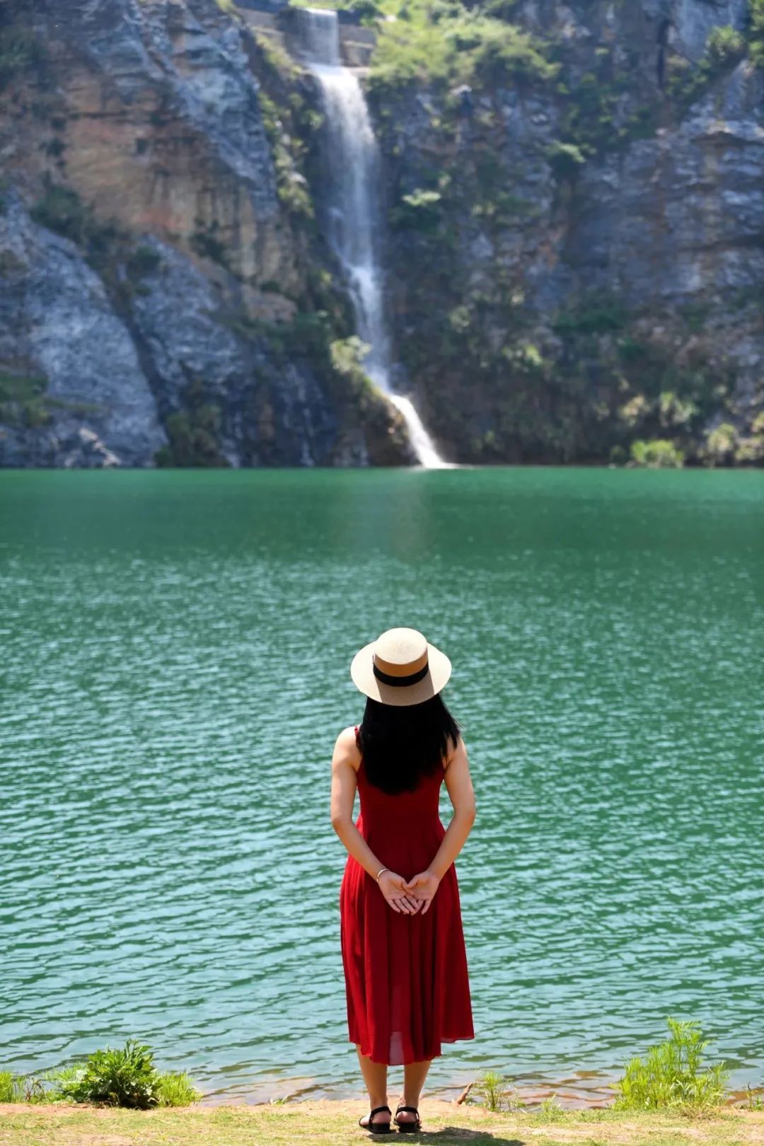 自上而下,一条50米高的瀑布由山顶垂直倾泻,飞溅的水滴变成湖面星星点点的光。山水相映,美得震撼。