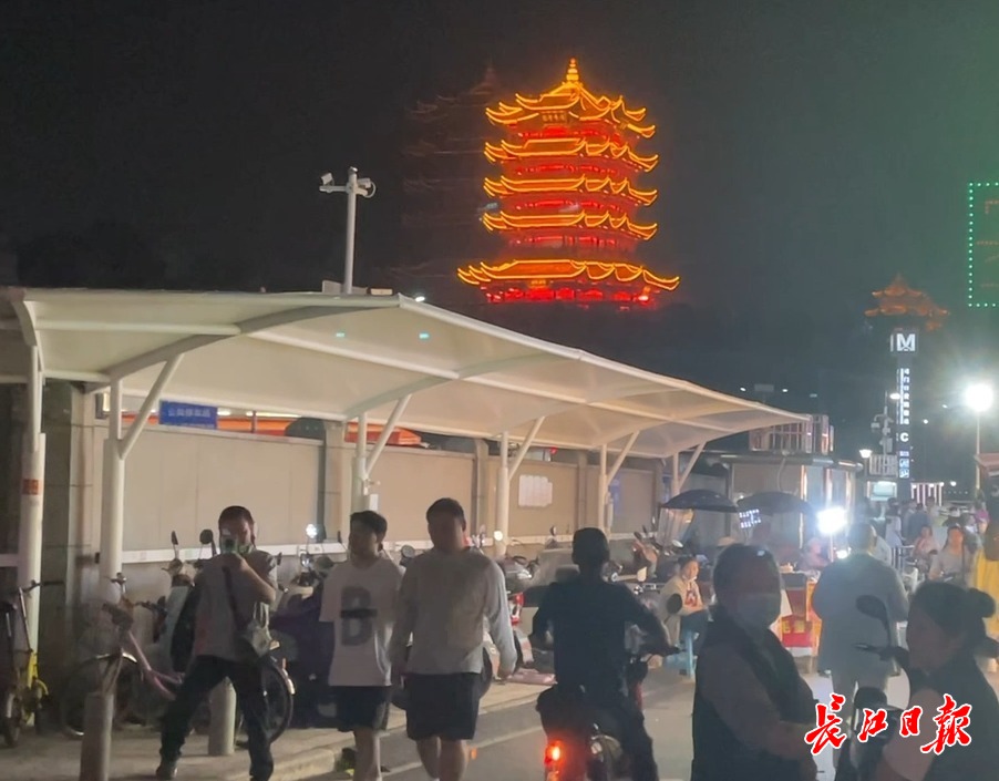 一位来自长沙的女孩告诉记者,一直在网上听说这个小区里可以打卡黄鹤楼。前一天晚上,她和朋友登上楼顶拍照,夜色下的黄鹤楼实在太美了。“我们上楼前将行李箱寄存到一楼的一处商铺里,轻手轻脚上楼,应该没有影响到居民休息。”
