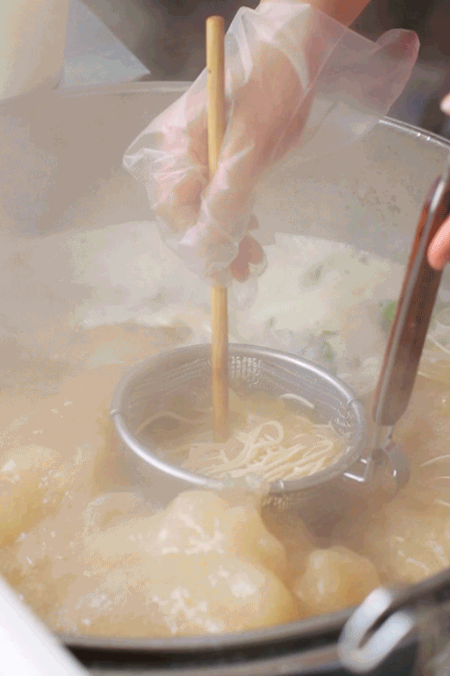 每天下午就要开始准备熬制第二天的鱼糊,新鲜野生喜头鱼一股脑下进锅里,不断地小火慢熬,直到一夜后,鱼肉、鱼髓甚至鱼骨纷纷熬化、熬不见了,再捞出杂质,得到一锅澄清的鱼汤。