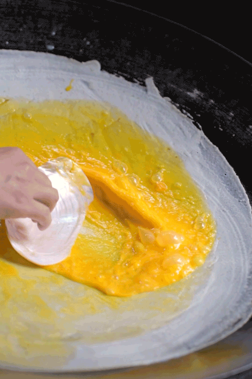 老板周师傅气定神闲地站在锅前,舀一勺面浆,用一扇光滑圆润的蚌壳摊匀,再打上6个鸡蛋,煎制、翻面、码糯米、撒臊子,一气呵成,动作柔和但利落,主打一个闲庭信步,像极了门派里镇场子的老前辈。