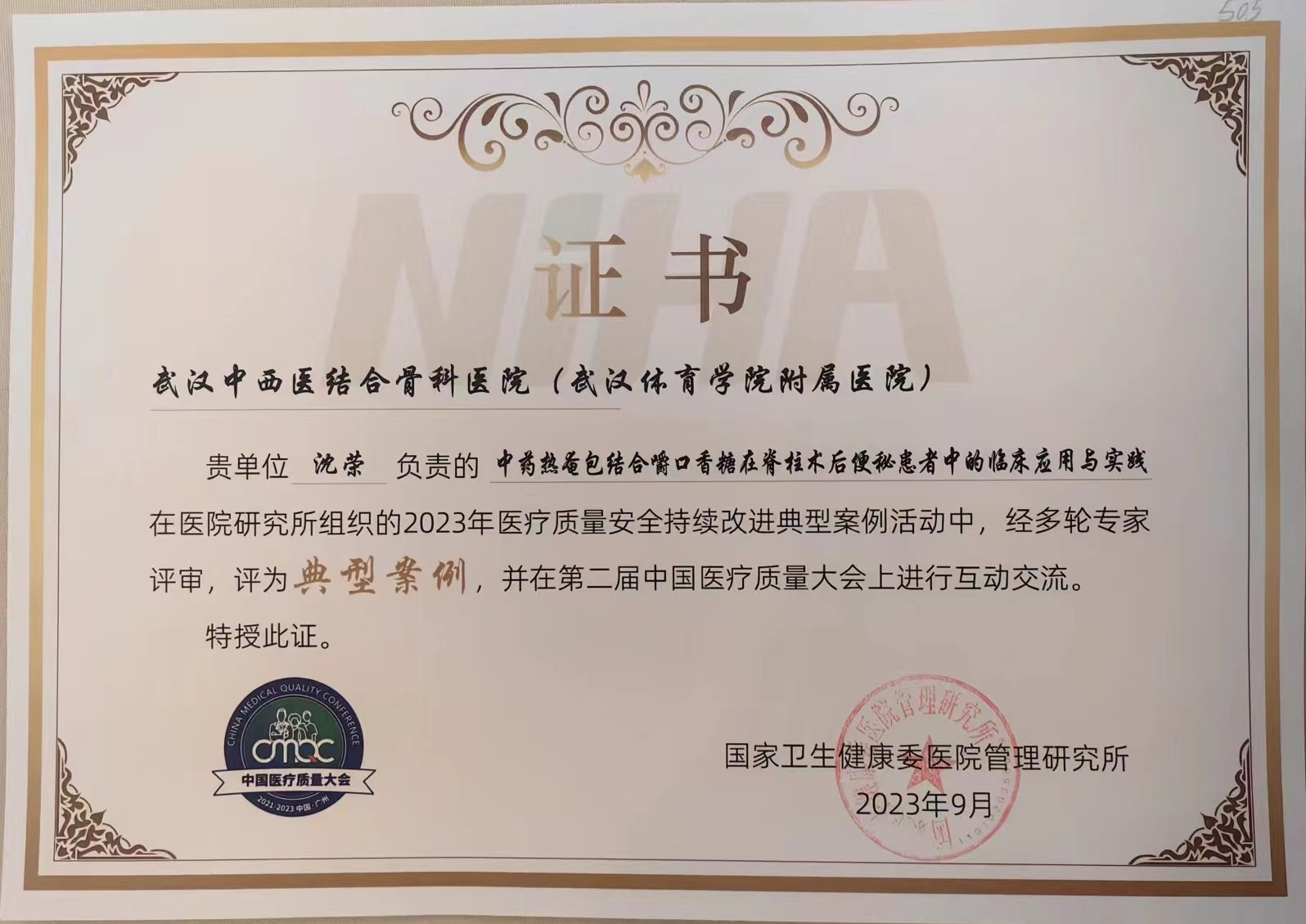 正是基于这种不断创新的精神和实践,沈荣主导的《中药热奄包结合嚼口香糖在脊柱术后便秘患者中的临床应用与实践》项目,凭借其独特的创新性和实用性,荣获了2023年中国医疗质量大会优秀典型案例奖。