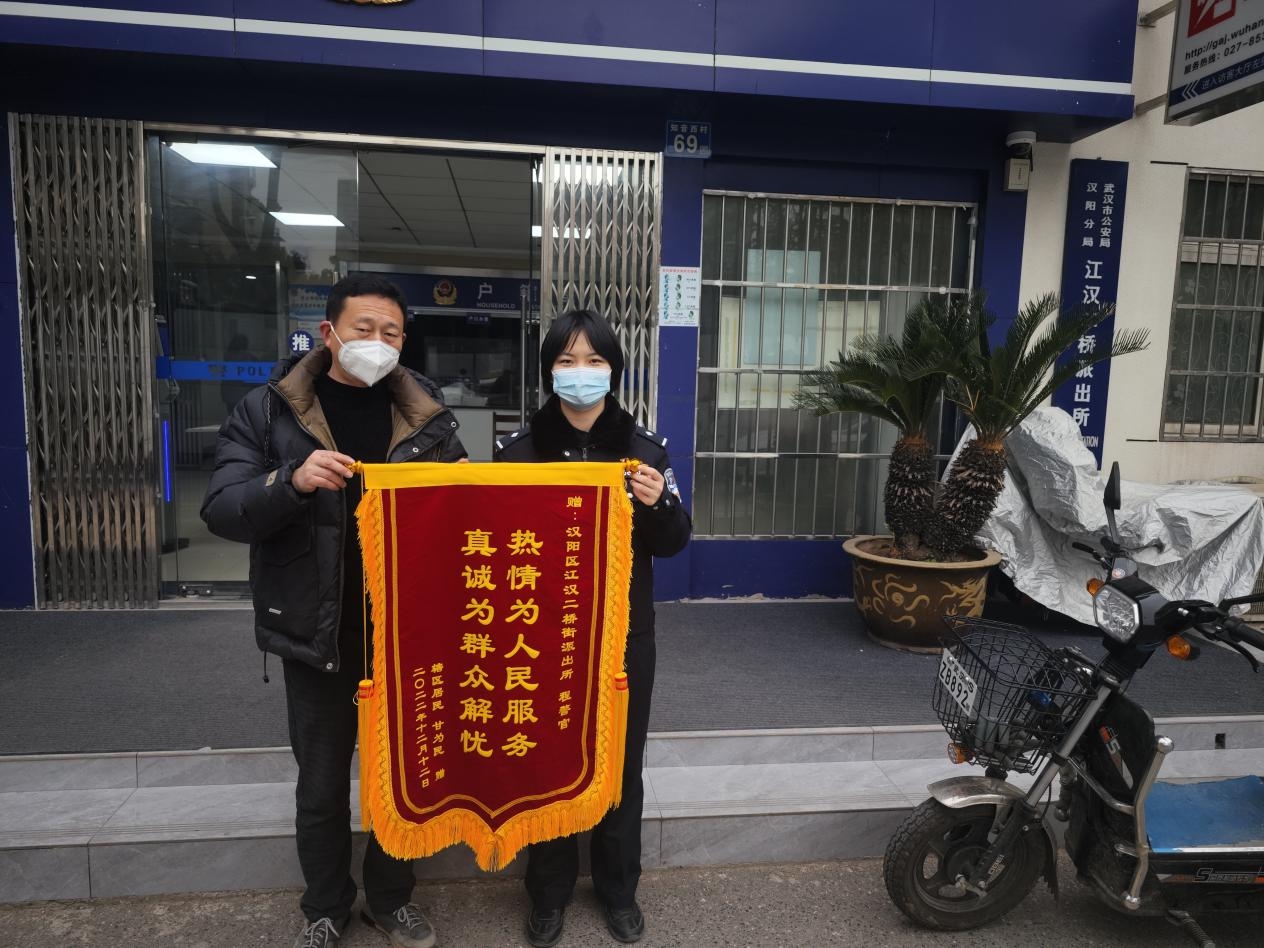 程世一(右)找回被盗电动车获赠从警第一面锦旗。 通讯员崔钧洋 摄