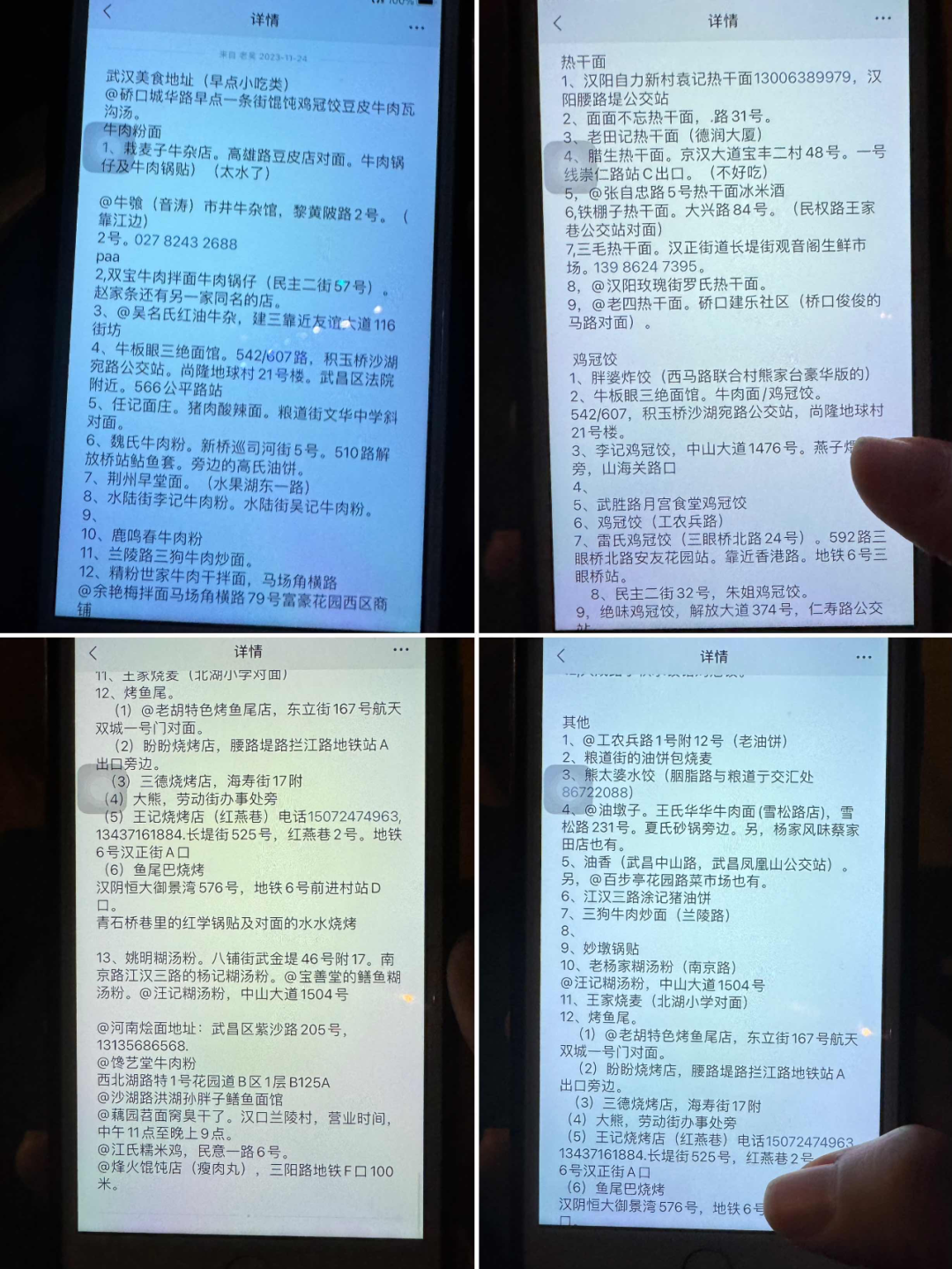 “你可以先拍照留着,这次用不上,还有下次嘛。”师傅又把手机递给我,让我全部拍下来,说这些地方都是他们常去吃的。之前做这些笔记本来是为了方便自己和同行找到物美价廉的小店,这几年来武汉旅游的外地朋友越来越多,遇到有需要的乘客,他也会把这份攻略分享给他们,希望大家都能吃到地道的武汉美食。“像热干面、牛肉粉、鸡冠饺、糊汤粉这些武汉特色小吃,大家还是要尝尝的。”