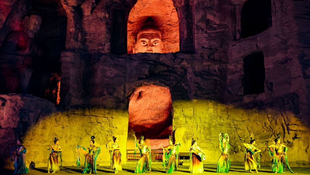 云冈石窟“又见云冈”大型实景艺术秀表演。新华社发
