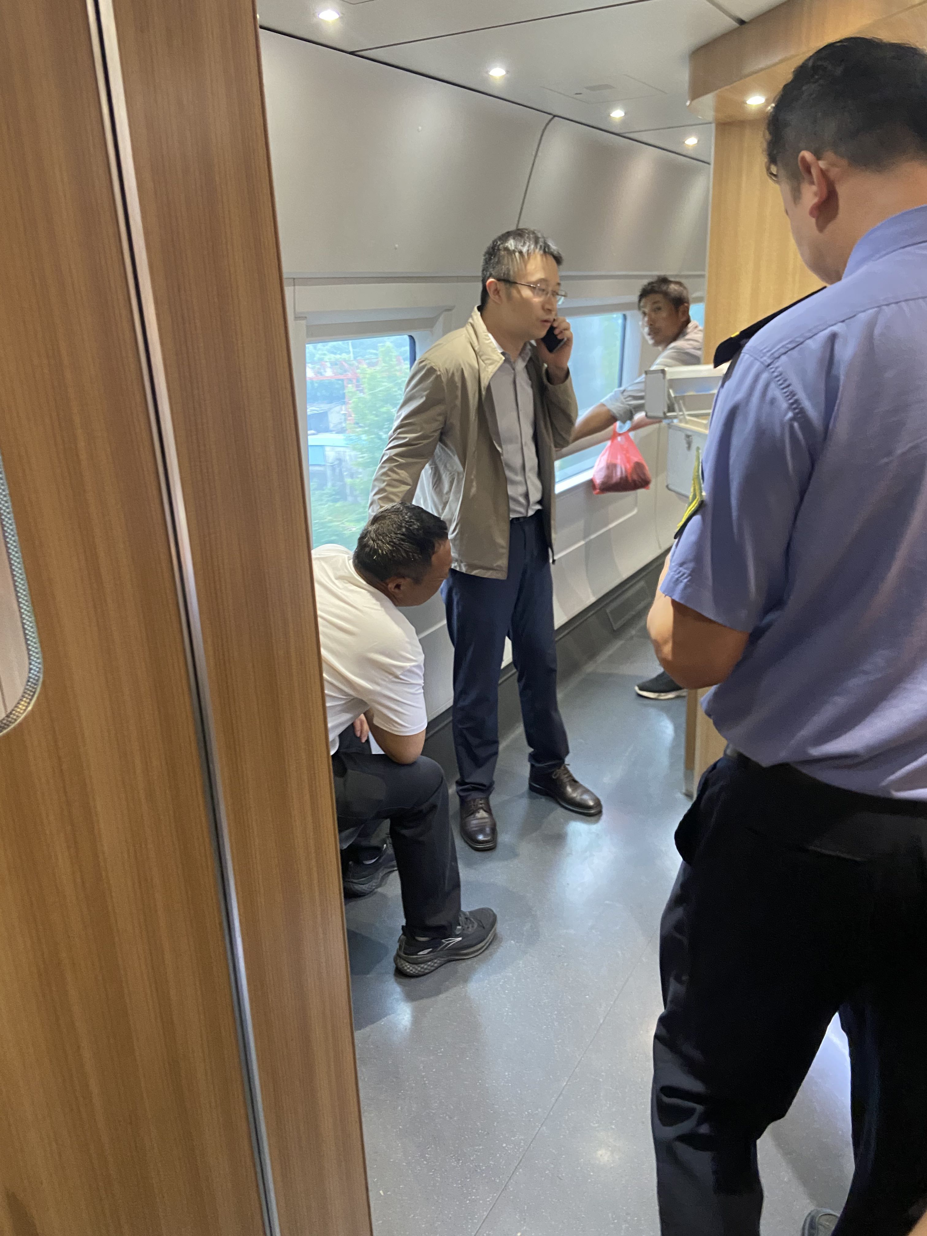 听到广播求救后,余伟民立即起身,穿过车厢奔赴事发地点。到达5号车厢后,他看到一位40多岁的男性,表情痛苦、捂着胸口蹲坐在车厢一角,列车长和乘务员在旁边安抚。