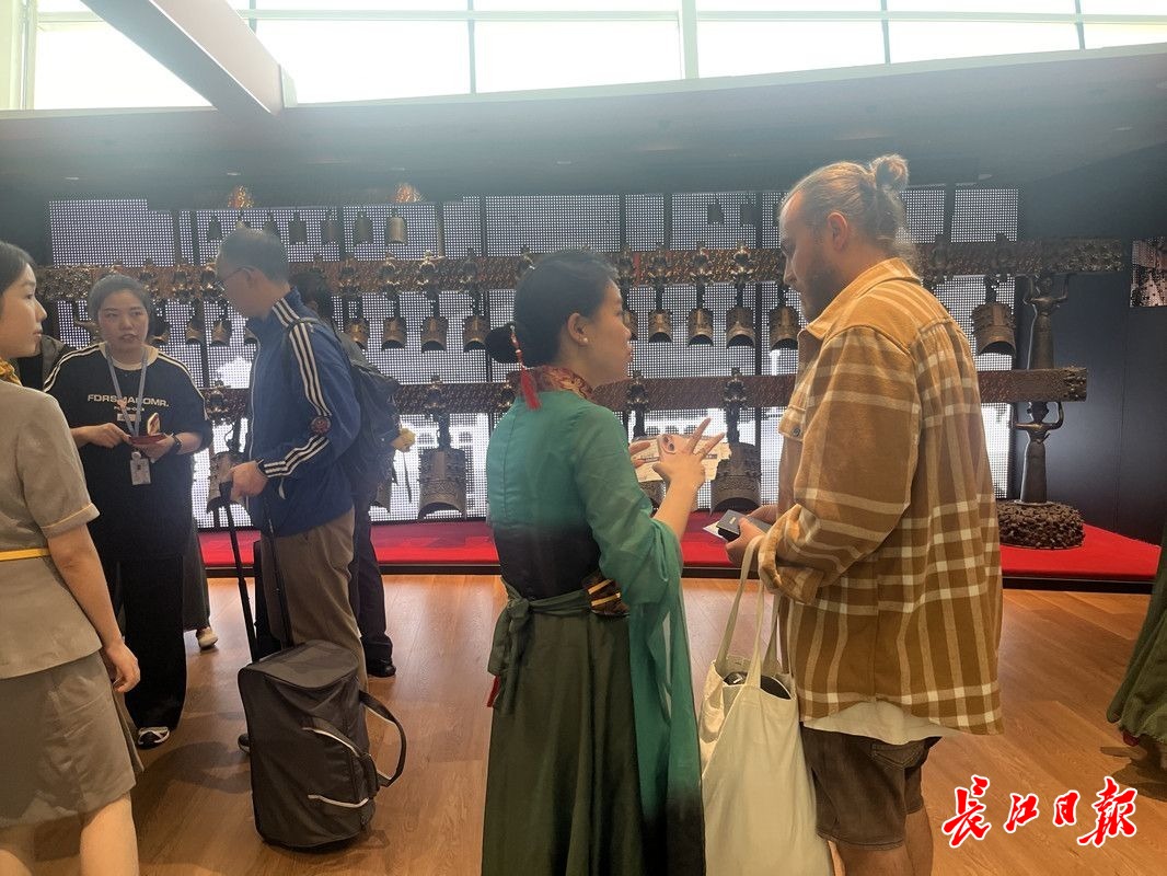 走进中转休息区,墙上“1比1.3”复刻的曾侯乙编钟吸引了众人目光,拿起木槌敲击,宫商之音悠久绵长。长达150米的休息区内,依次分布着餐食区、茶歇区、阅读区和休息区。排骨藕汤、粉蒸肉、土豆烧鸡肉……清一色湖北家常菜令人食欲大增;免费的饮品和茶歇无限供应;茶艺区,旅客可以一边品鉴恩施红茶,一边欣赏表演;休息区,带有隔断的真皮大沙发,舒适又私密。