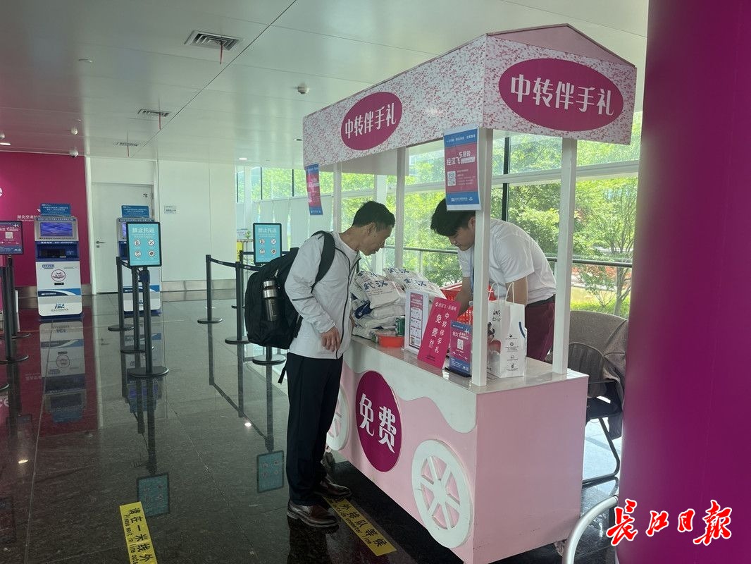 “经汉飞·乐易转”中转服务台前,不时有中转旅客前来咨询办理业务,一旁的“中转伴手礼”柜台,堆着一桌子中转礼品,诚意满满地迎接中转旅客到来。