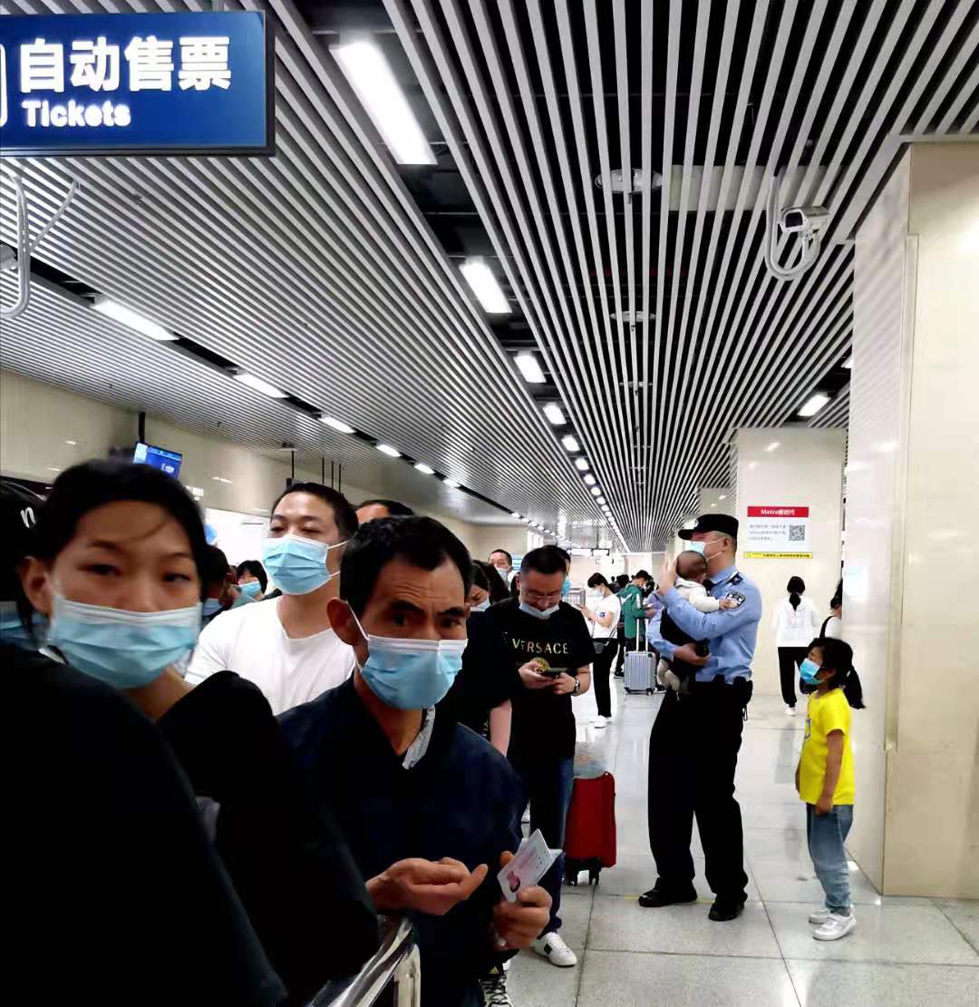 5月4日下午,武汉市轨道交通二号线汉囗火车站 一位值班警察见一位母亲抱着小孩购票不方便,主动将小孩抱过来,获得旅客们的点赞。 城市摄影队 朱德祥 摄
