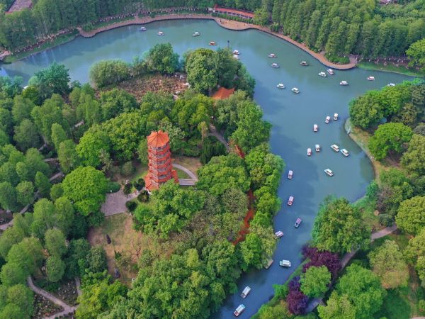 鸟瞰汉口解放公园,游船如织、湖光塔影、绿树成荫。 城市摄影队王芳 摄