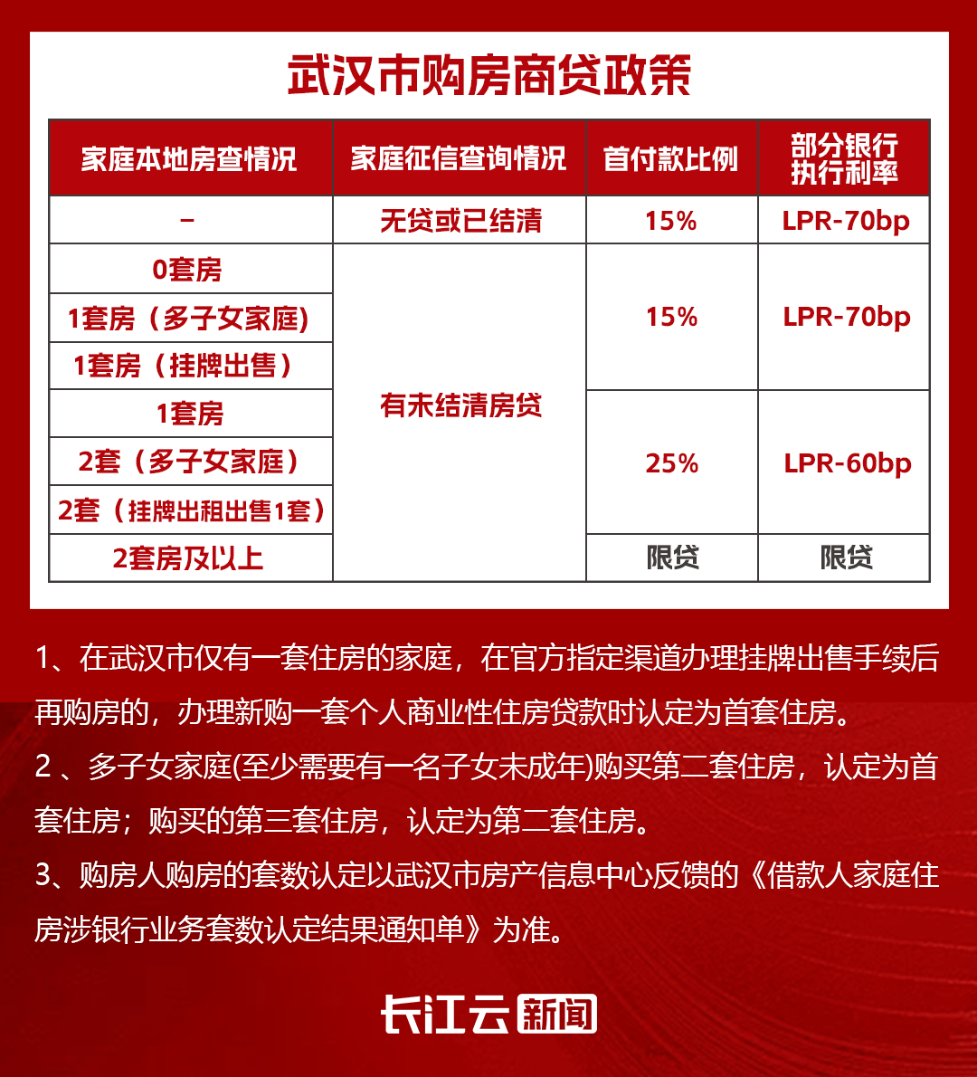 值得一提的是,“首套房”的认定上,目前的政策也十分宽松。按照武汉市住房保障和房屋管理局最新规定:对生育多子女家庭在购房贷款时,购买的第二套住房认定为首套住房。在武汉市仅有一套住房且正挂牌出售的家庭,办理新购一套个人商业性住房贷款时认定为首套住房。